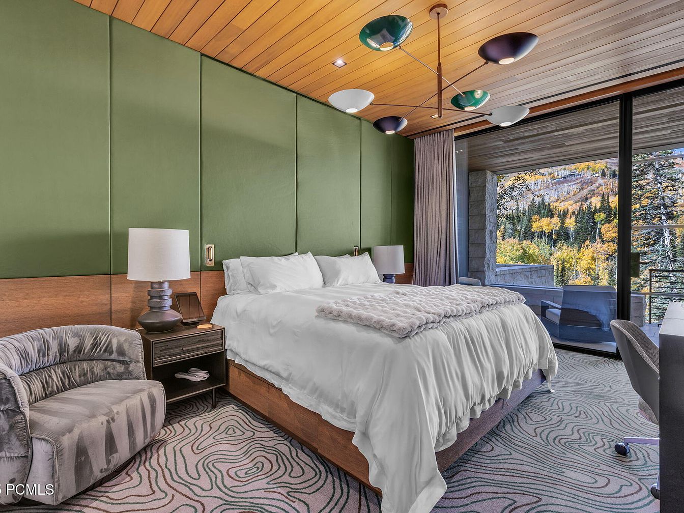 This master bedroom showcases a harmonious blend of modern design and natural beauty. The striking olive green accent walls complement the warm wooden ceiling, creating a calming atmosphere. A plush, oversized bed promises comfort, flanked by sleek bedside lamps that add both function and style. A chic velvet chair invites relaxation, while a contemporary area rug with swirling patterns adds a touch of artistic flair to the floor. Large windows frame breathtaking nature vistas, enhancing the room’s spaciousness and bringing the outdoors in. Thoughtfully designed for tranquility, this space exemplifies luxury living combined with family-friendly comfort.