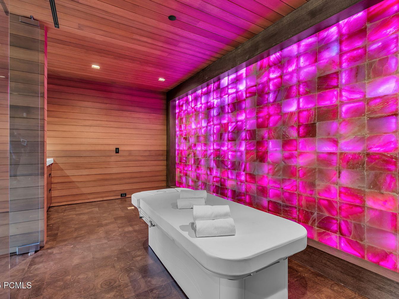 This serene spa room features warm wooden tones, creating a soothing atmosphere perfect for relaxation. The highlighted pink salt wall adds a modern flair, contributing both aesthetic appeal and health benefits. A minimalist massage table with neatly folded towels invites tranquility, while the glass shower area enhances functionality without compromising style. Subtle recessed lighting illuminates the space, complementing the natural wood paneling. This retreat is designed for family comfort, promoting wellness and connection, making it an ideal escape for rejuvenation. Soft textures and a calming color palette contribute to an overall sense of peace and harmony.
