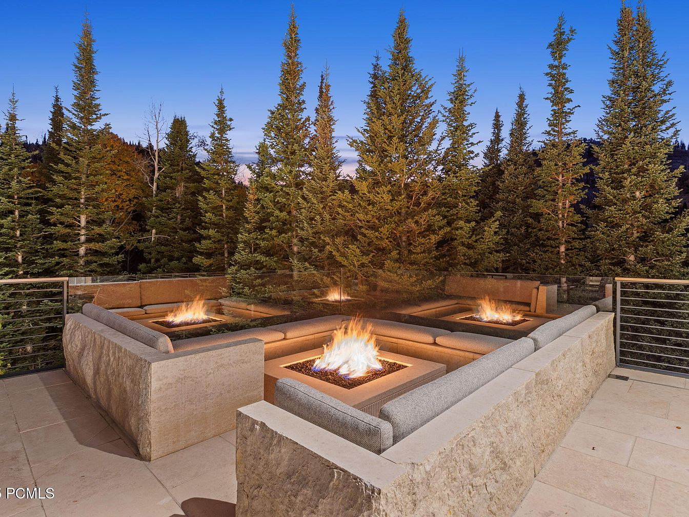 This serene outdoor fire pit area blends seamlessly with nature, featuring multiple sleek fire pits encased in smooth stone. The layout encourages social gatherings, with ample seating consisting of modern, cushioned benches that invite relaxation. Tall, lush evergreens surround the space, enhancing privacy while creating a tranquil atmosphere. The color palette plays with earthy tones, combining warm stone with soft gray upholstery, embodying a contemporary aesthetic. The open space is perfect for family gatherings or cozy evenings under the stars, making it an ideal retreat for enjoying the beauty of the natural surroundings.