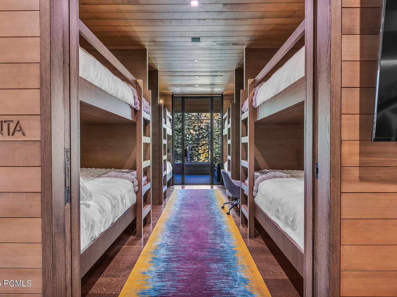 This inviting bunk room features a warm wooden design, showcasing sturdy built-in bunks that accommodate multiple guests, perfect for family getaways. The cozy layout is enhanced by a rich brown color palette, creating a serene and comfortable atmosphere. Each bunk is equipped with plush bedding, ensuring a restful night’s sleep. A vibrant, multicolored rug runs down the center, adding an artistic touch to the space, while large windows provide an abundance of natural light and stunning views of the outdoors. Functional furniture, including a workspace, complements the family-friendly design, making it ideal for an active household.