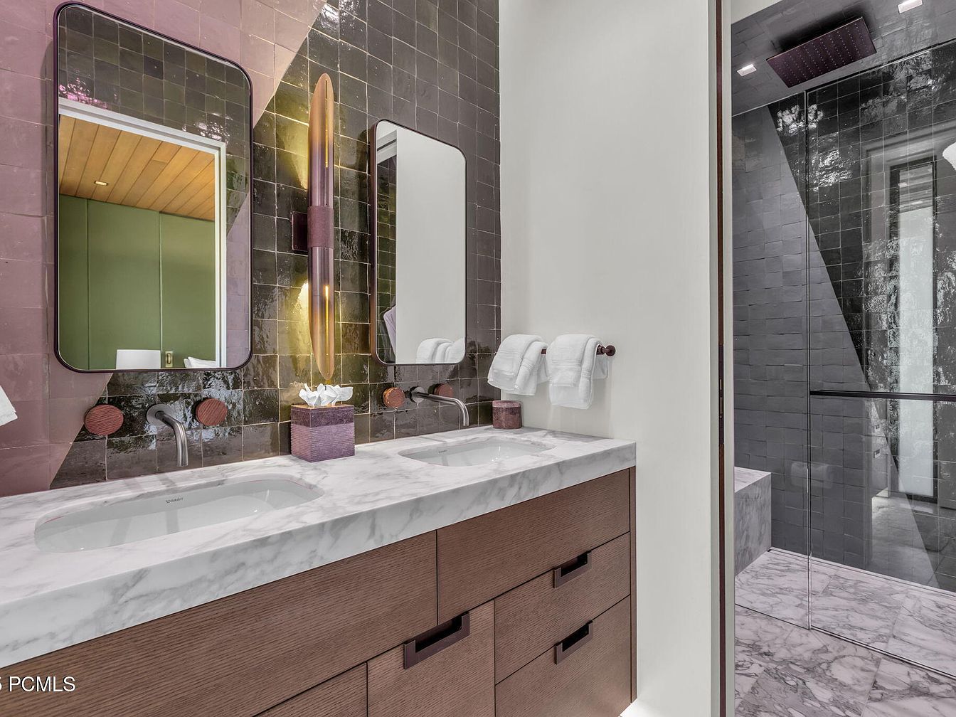 This chic bathroom features a sleek dual vanity with a polished marble countertop, harmonizing with the warm wooden cabinetry below. Elegant mirrors are flanked by stylish wall sconces that provide ambient lighting, enhancing the contemporary feel. A unique accent wall showcases deep green and rich brown tiles in geometric patterns, creating a striking visual appeal. Family-friendly elements include spacious countertops and a fully enclosed glass shower, ensuring safety and functionality. The neutral color palette, combined with modern fixtures, exudes tranquility, making this bathroom a serene retreat within the home, perfect for both relaxation and daily routines.
