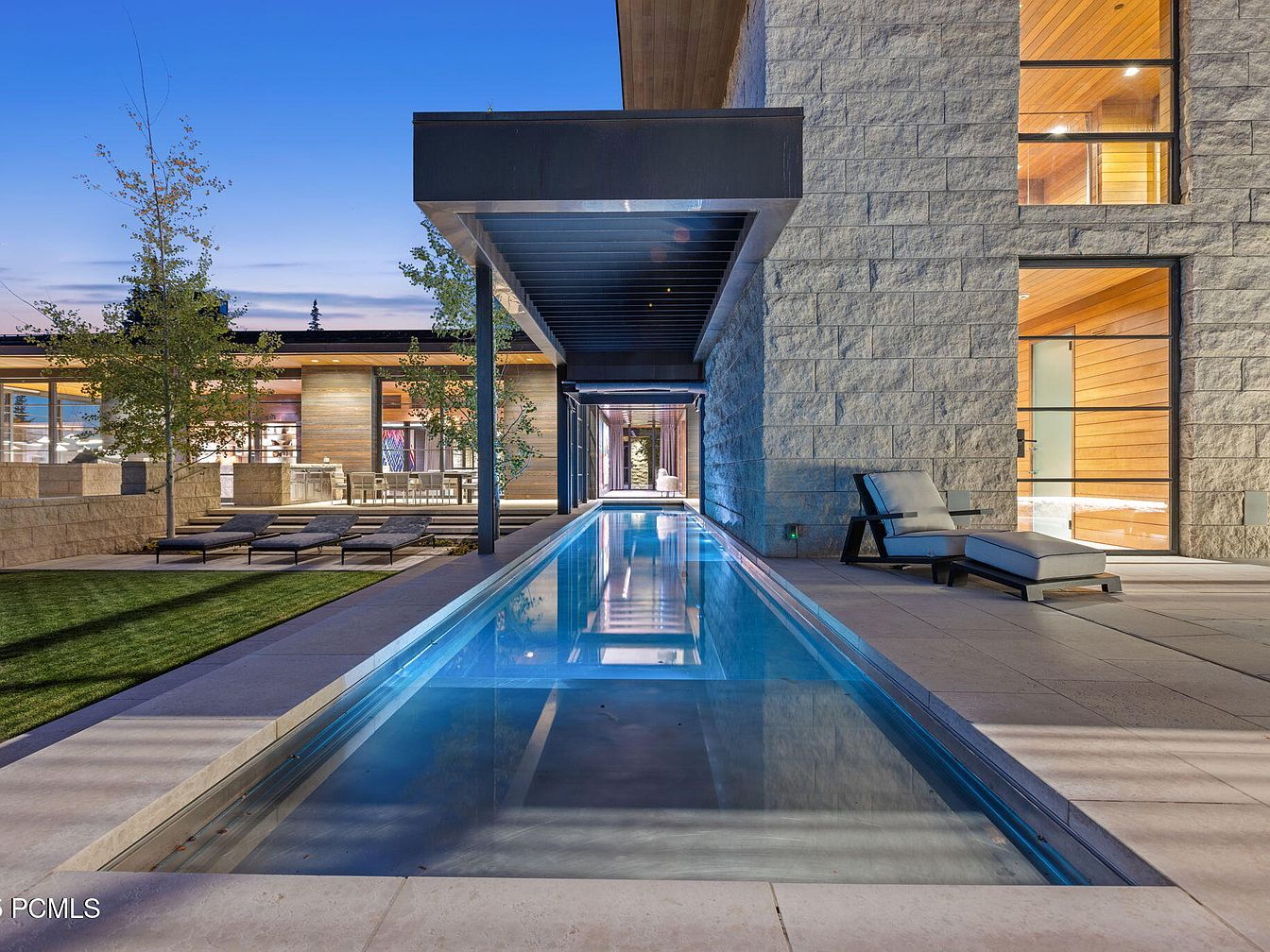 An inviting outdoor living space seamlessly integrates nature and luxury. A tranquil swimming pool, framed by elegant stonework, reflects the evening sky, creating a serene atmosphere. The layout features spacious areas for lounging, highlighted by sleek chaise lounges positioned on lush green grass. Light wooden accents in the nearby structure enhance the contemporary aesthetic, providing a warm contrast to the cool hues of the pool. Large windows allow for a bright and airy feel, while the overhanging roof offers shade. This versatile space is perfect for family gatherings or quiet relaxation, promoting a harmonious connection to the outdoors.
