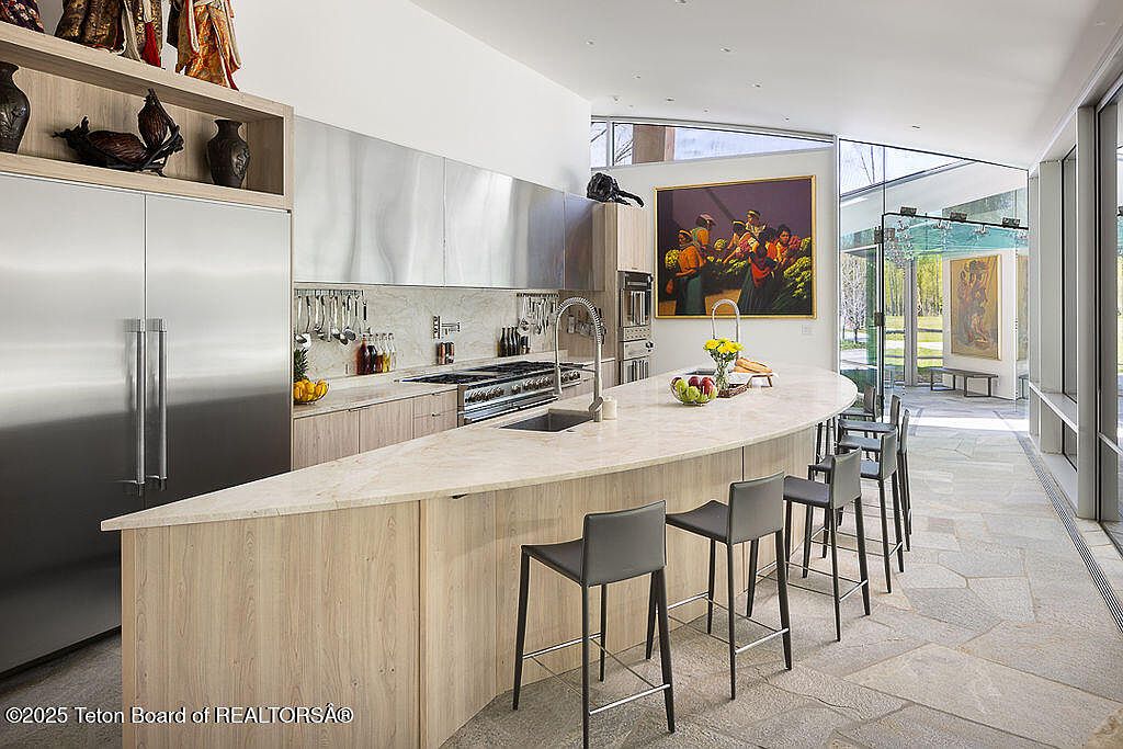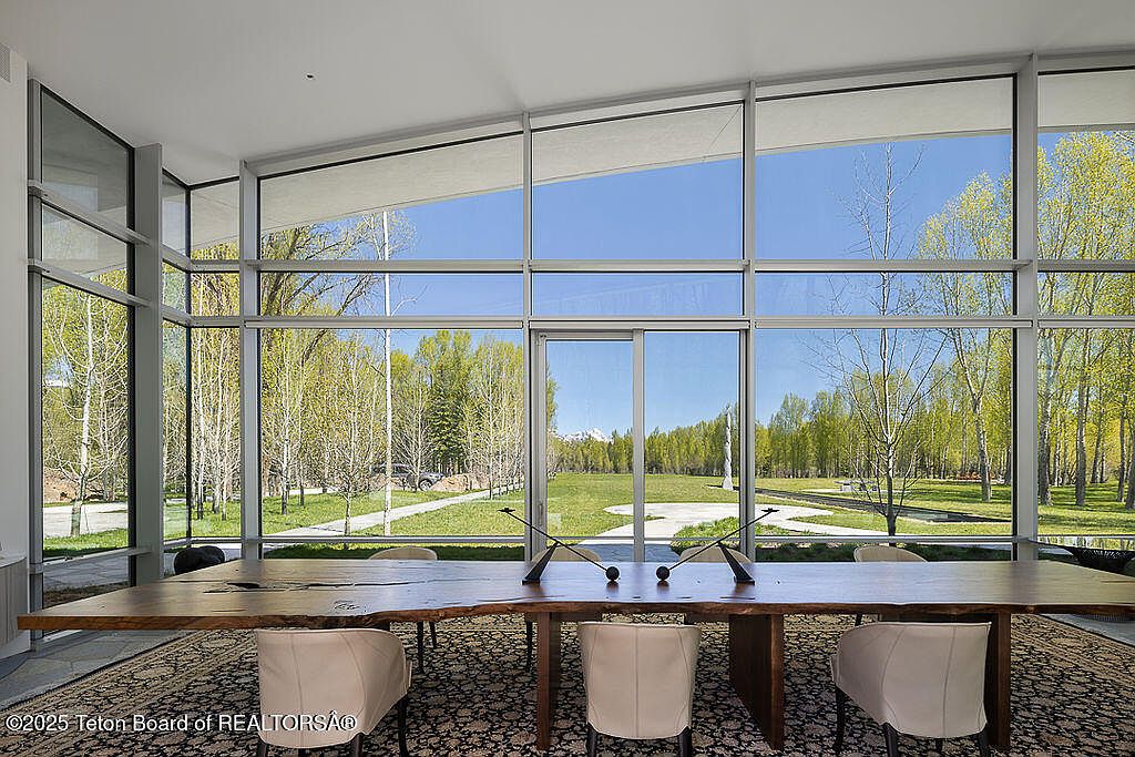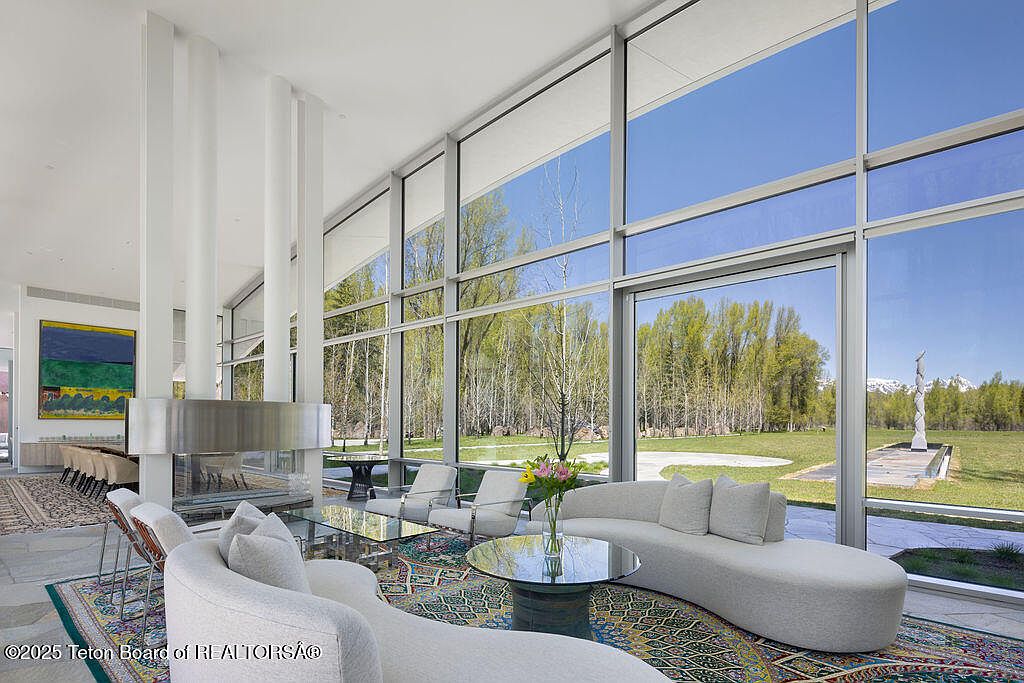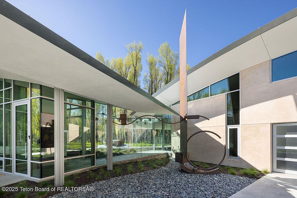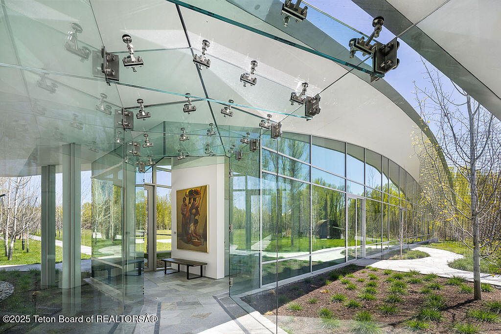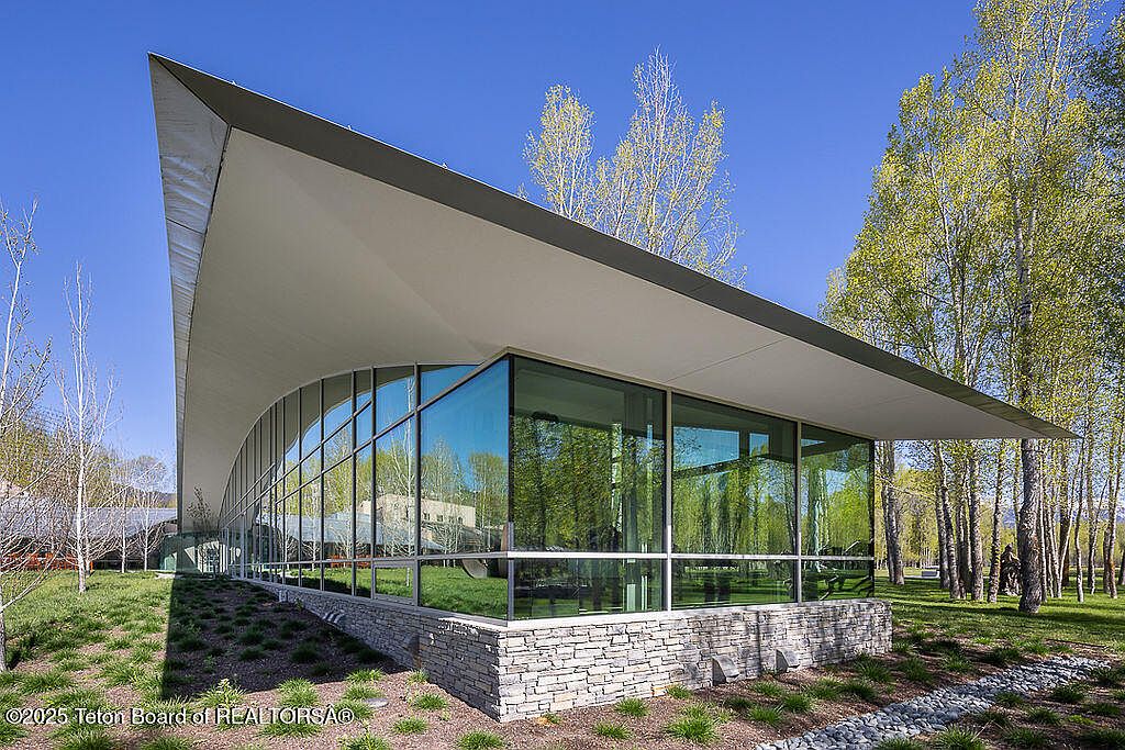 This exquisite home, completed in 2023 and designed by acclaimed architect Wallace Cunningham, embodies modern success with its integration of luxurious living and nature in Wilson, WY. Valued at $60 million, it boasts expansive Teton views and exclusive Snake River frontage, establishing its prestigious status. The architectural style features a sweeping sculptural roof and vast glass elements that meld interiors with the surrounding landscape. With five en-suite guest rooms, a professional-grade kitchen, and an innovative glass corridor, it supports both private retreat and entertaining. Recent renovations ensured sophisticated touches throughout, while its prime location grants access to trails, world-class skiing, and a historical lodge, enhancing the allure for forward-thinking individuals.