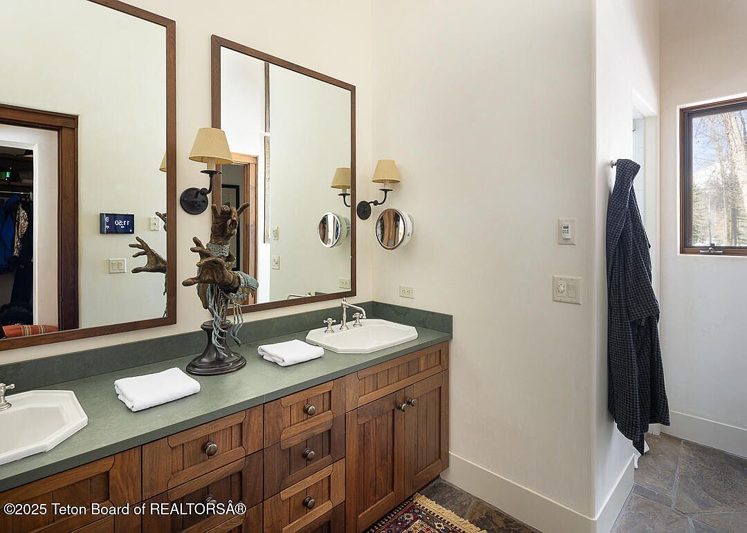 This serene bathroom features a spacious double vanity with rich, dark wood cabinetry that enhances warmth. The sophisticated green countertop complements the minimalist color scheme enriched by neutral walls, evoking a calming atmosphere. Each sink is delicately positioned beneath large framed mirrors, reflecting ample light from stylish sconces beside them. A rustic decorative accent on the counter adds an artistic touch, while plush white towels offer both comfort and luxury. The natural light streaming through the window illuminates the space, creating an inviting and family-friendly ambiance ideal for relaxation and rejuvenation.