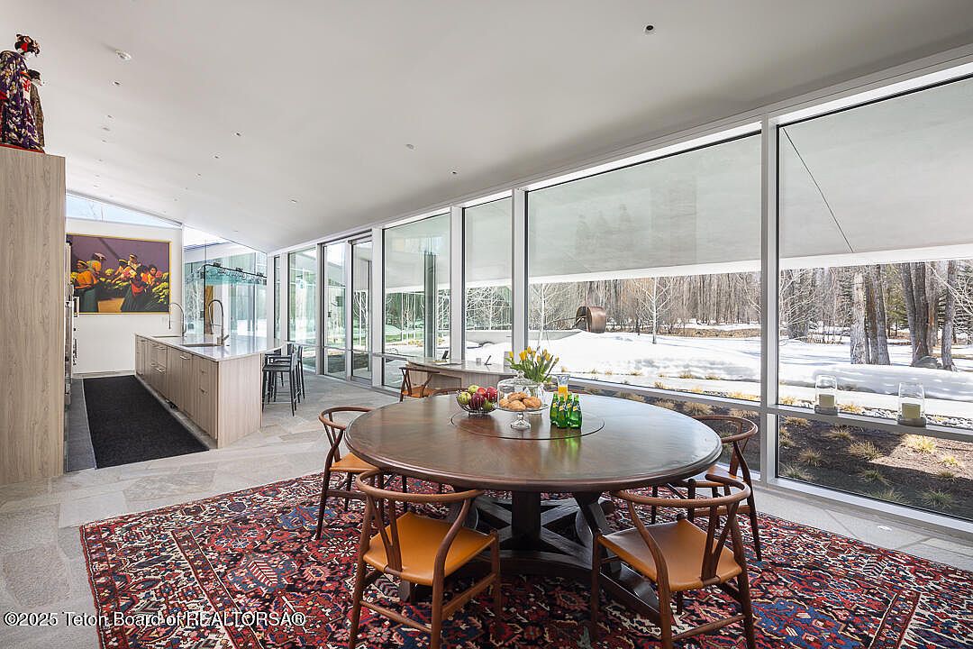 This dining area blends modern elegance with a warm, inviting atmosphere. A round wooden table is surrounded by stylish chairs, perfect for family gatherings. Large windows flood the space with natural light, offering a picturesque view of the snowy landscape outside. A plush area rug adds a splash of color, harmonizing beautifully with muted wall tones and sleek cabinetry that enhances the contemporary design. Decorative art pieces bring personality, while the open layout encourages seamless flow between spaces. Thoughtfully designed for family-friendly living, this area is ideal for enjoying meals together and creating lasting memories.