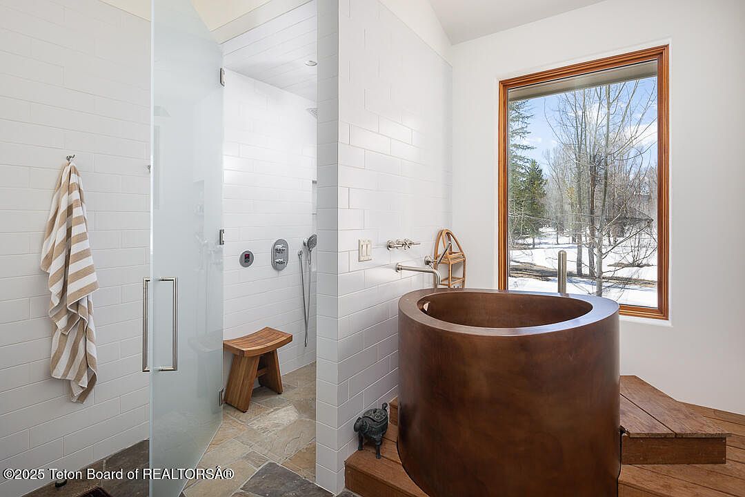 This luxury bathroom features a harmonious blend of modern design and natural elements. Crisp white tiles create an airy feel, while a stunning wooden soaking tub adds a touch of warmth. The sleek glass shower showcases a high-end shower system, highlighting contemporary aesthetics. Ample natural light flows through the large window, framing views of the tranquil outdoors, enhancing the serene ambiance. An elegant wooden stool complements the organic materials, ensuring comfort and accessibility. The neutral color palette promotes relaxation, making this bathroom a perfect sanctuary for unwinding after a long day, focusing on both style and functionality.