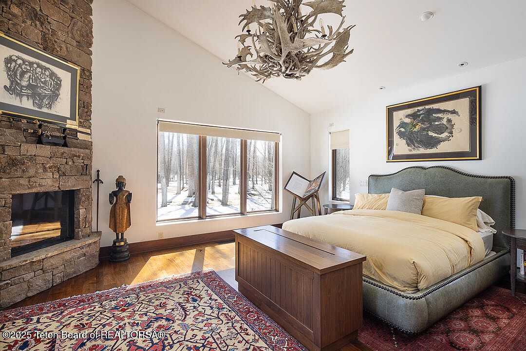 This spacious master bedroom features a serene ambiance, highlighted by large windows that invite natural light and offer picturesque views of the landscape. The focal point is a striking stone fireplace adorned with an antler mount, bringing a rustic charm to the contemporary design. Soft beige walls complement the warm wood tones of the furniture, including a low-profile bed with plush bedding. A cozy plaid chair adds a touch of comfort, while the elegant area rug ties the space together. Thoughtful architectural details, such as high ceilings and modern lighting, enhance the room’s inviting, family-friendly vibe.