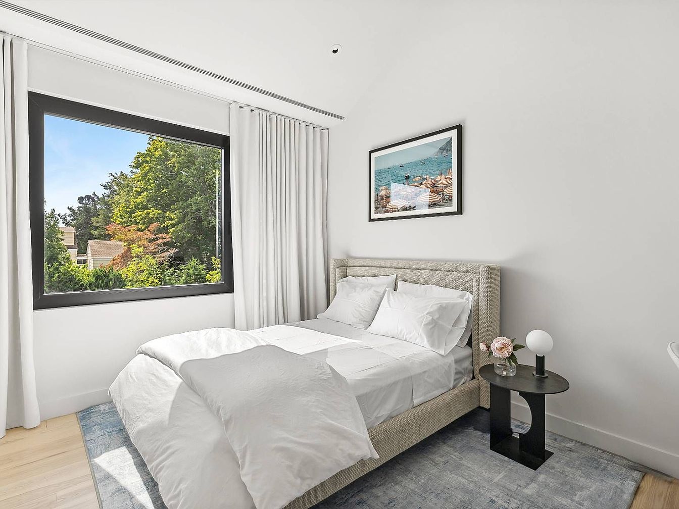 This serene bedroom features a soft neutral palette with crisp white walls and linens, creating a peaceful and inviting atmosphere perfect for relaxing or spending time with family. The room enjoys generous natural light thanks to a large window with a striking black frame, offering a verdant view of lush trees outside. Sleek wood nightstands flank the upholstered bed, each topped with a matte black lamp that adds a touch of modern sophistication. Minimalist drapes provide privacy, while a monochrome landscape art piece anchors the wall, blending contemporary design with warmth for all ages.