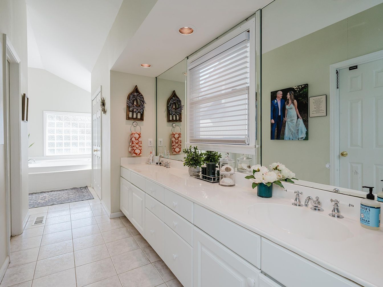 A modern bathroom features a spacious layout adorned with elegant elements. The dual-sink vanity boasts gleaming white countertops framed by soft green walls, promoting a serene ambiance. Ample natural light filters through a nearby window, enhancing the airy feel, while decorative accents, such as potted plants and framed memories, add a personal touch. The textured tile floor complements the sleek design, ensuring easy maintenance for families. Adjacent to the vanity, a luxurious soaking tub invites relaxation. Practicality meets aesthetics here, creating a tranquil retreat that underscores the home’s thoughtful design and attention to family-friendly features.