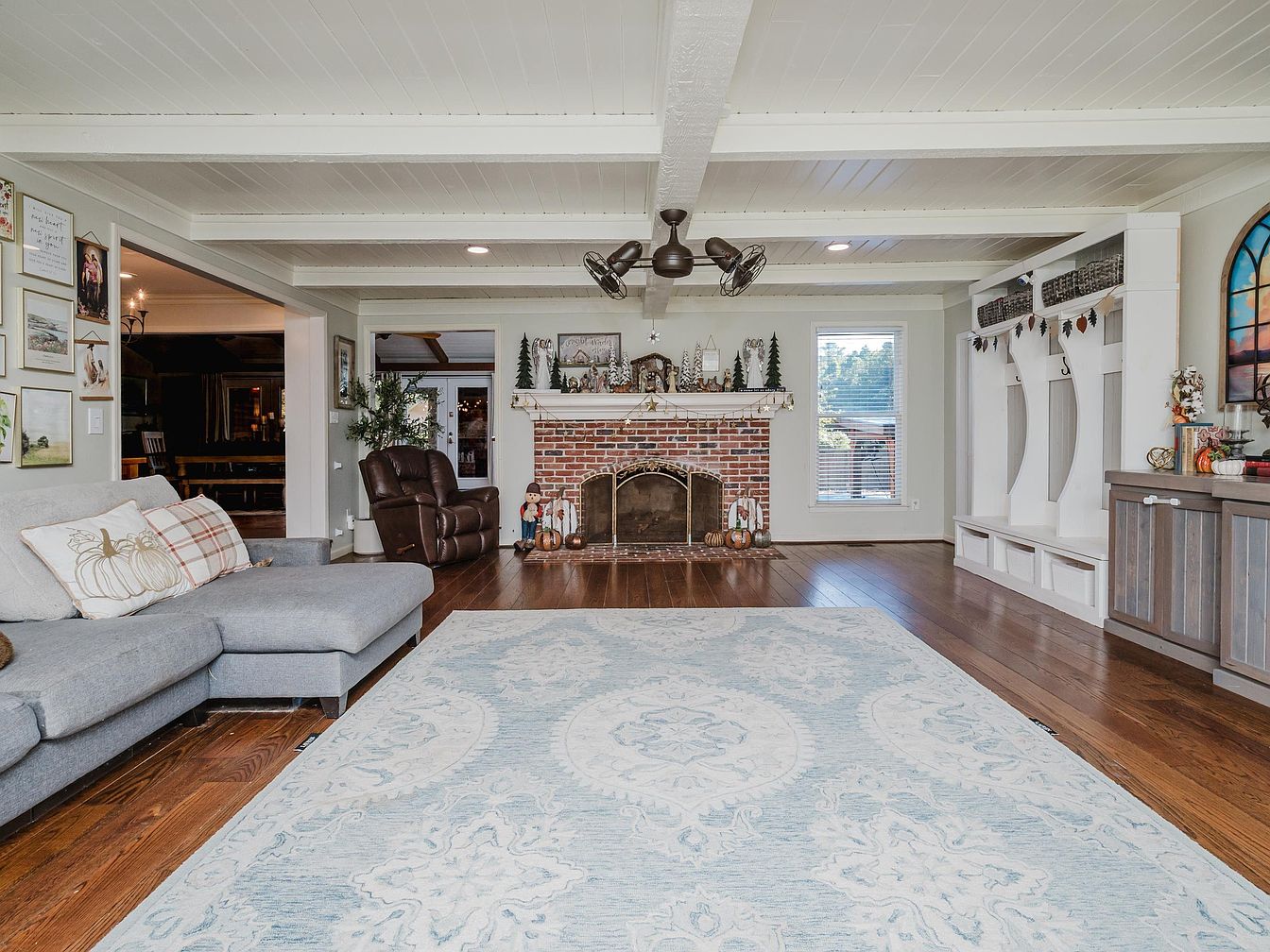 This inviting living room features a spacious layout with warm, rich wooden floors and a striking exposed beam ceiling. A plush gray sectional sofa offers ample seating, adorned with decorative throw pillows. The focal point is a beautifully designed brick fireplace, elegantly styled with seasonal decor, creating a cozy atmosphere. The room is enhanced by natural light streaming through large windows, complemented by a soft, pastel area rug adding a touch of color. Family-friendly elements include built-in storage benches for easy organization and a welcoming atmosphere perfect for gatherings and relaxation.