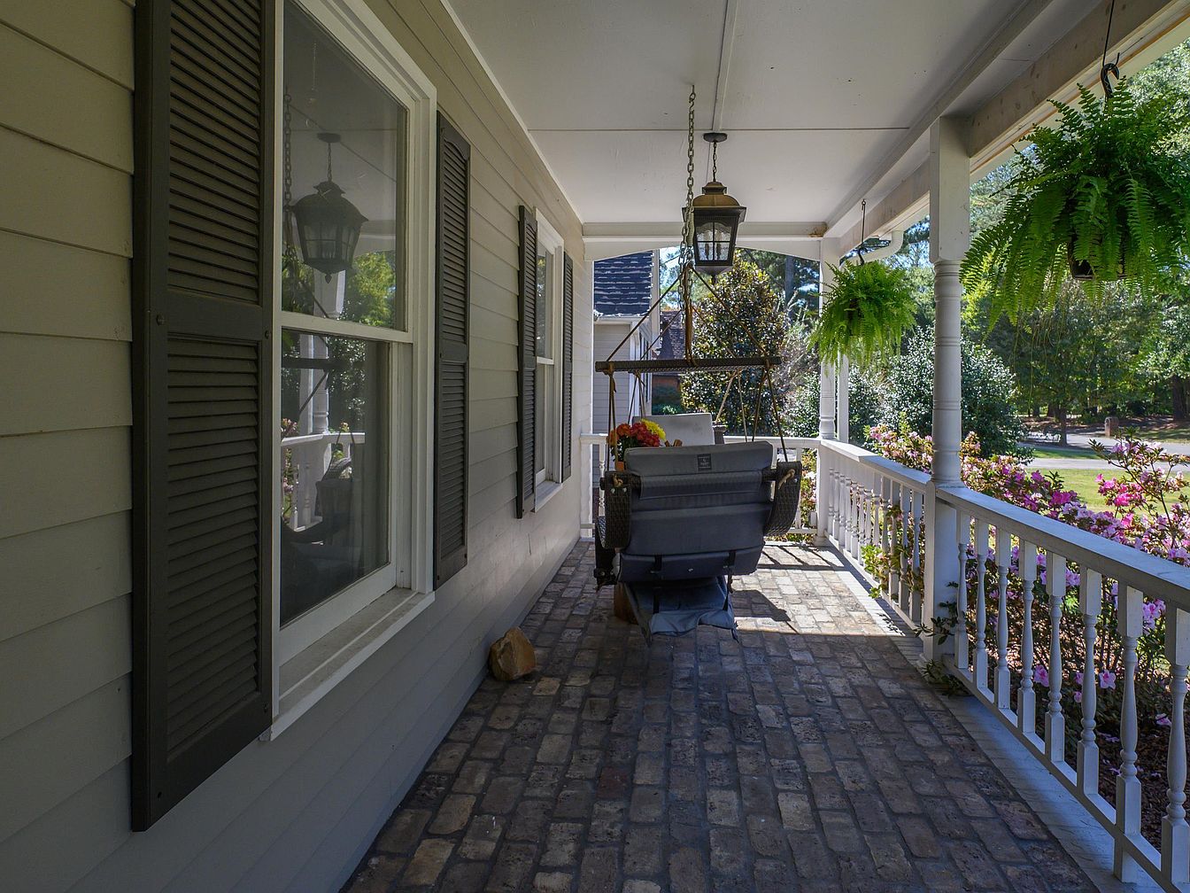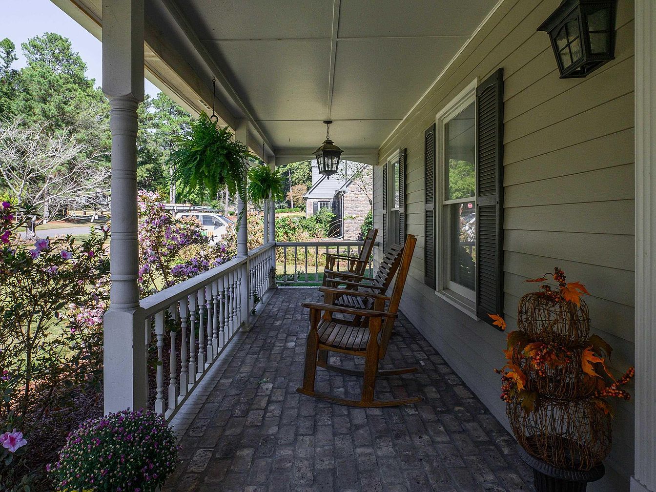 This inviting front porch features rustic rocking chairs, perfect for leisurely afternoons. The textured brick flooring provides a sturdy, timeless aesthetic, while the white railing and pillars create an airy feel. Lush ferns hang from above, adding a natural touch, complemented by vibrant potted flowers nestled at the base. Architectural details like shuttered windows and a lantern give the home a classic southern charm. The space is both family-friendly and welcoming, encouraging gatherings or quiet moments while overlooking a beautifully landscaped garden. The harmonious blend of colors and materials creates a serene outdoor retreat.