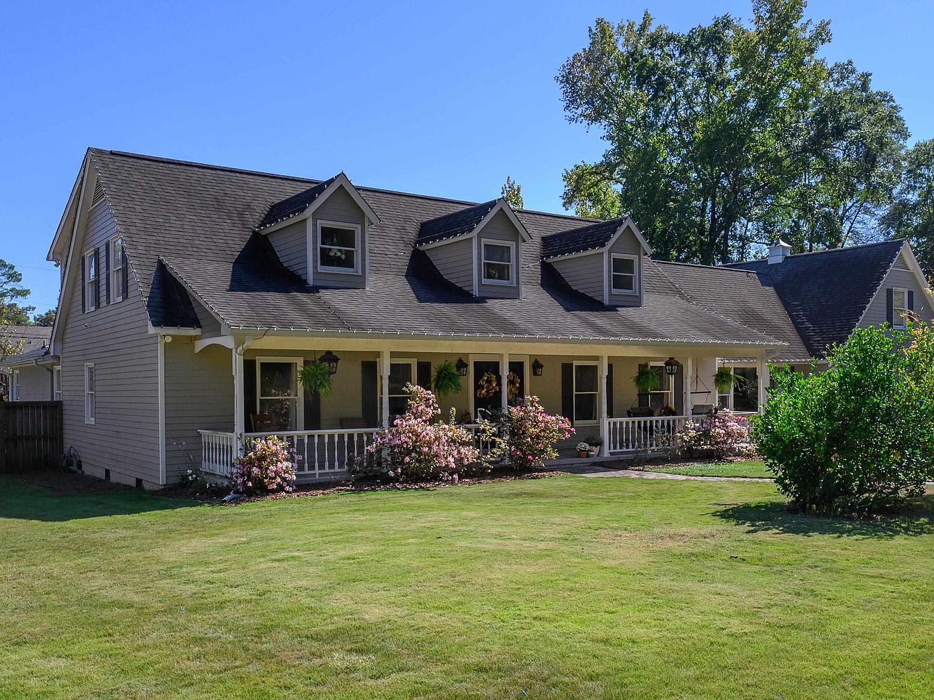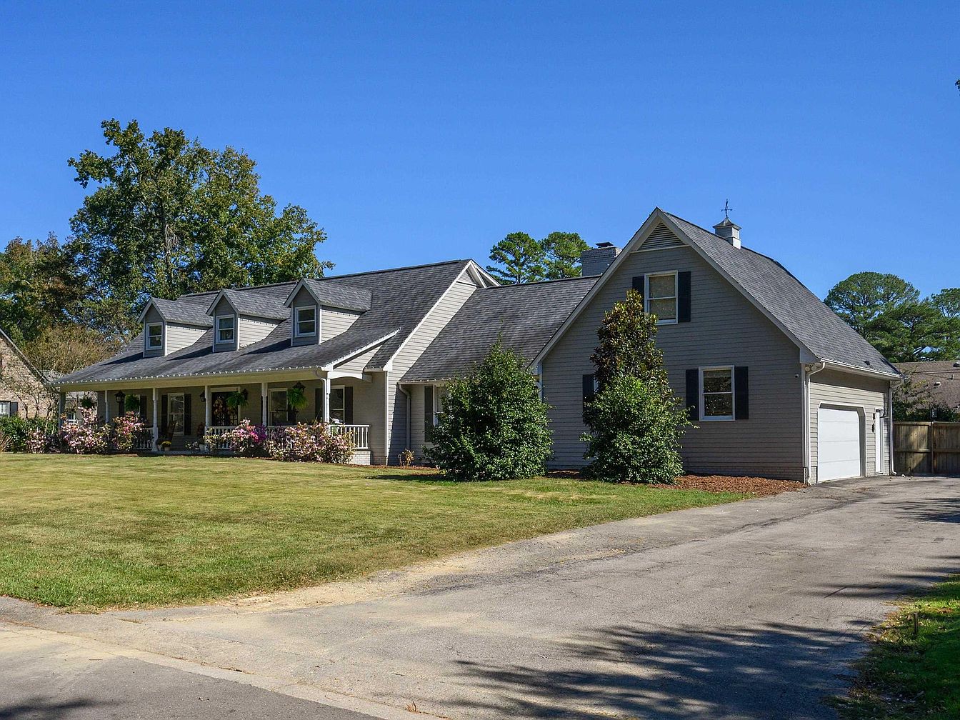 This American home showcases a beautifully designed front exterior featuring a welcoming porch with ample seating space, perfect for family gatherings. The architectural elements include a sloped roof with charming dormer windows, enhancing its character. A soft gray siding, accented by white trim and black shutters, creates a harmonious color scheme. Lush green lawns framed by flower beds add to the inviting atmosphere, while ornamental trees provide shade and privacy. The carefully groomed landscape complements the home’s design, making it ideal for children and pets to play safely. The attached garage adds convenience without disrupting the aesthetic.