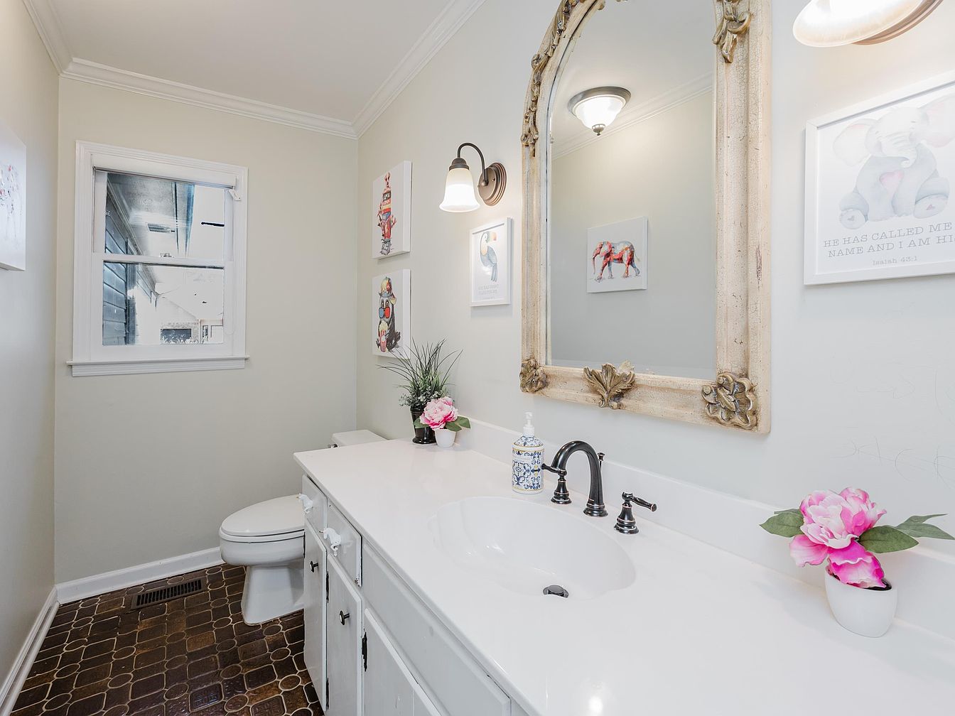 This charming bathroom showcases a clean and inviting design, featuring a spacious, white marble countertop that enhances the airy atmosphere. A large ornate mirror hangs above the sink, framed intricately to add a touch of vintage elegance. The soft color palette of light beige walls complements the dark, patterned tile flooring, creating a warm contrast. Family-friendly elements include easily accessible fixtures and vibrant artwork that appeals to all ages, adorning the walls with playful themes. Natural light streams through a classic window, illuminating the fresh greenery and flowers, enhancing the overall sense of tranquility in this stylish space.