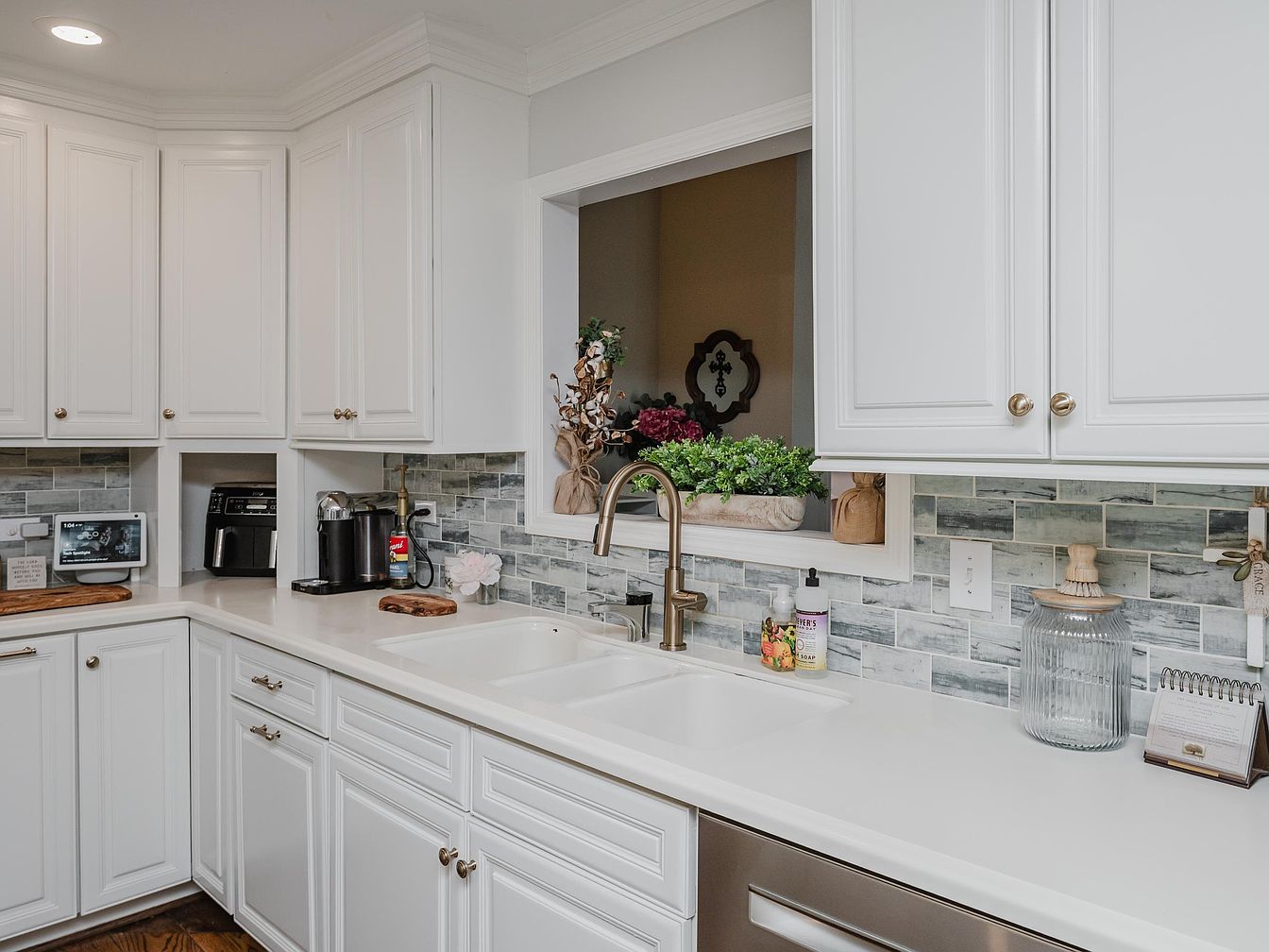 This modern kitchen features sleek white cabinetry that complements the bright, airy atmosphere. A large, dual-basin sink sits beneath a stylish matte gold faucet, enhancing the contemporary aesthetic. Soft hues of gray and white in the backsplash tile add a subtle texture, while decorative greenery peeks from an open window, bringing a touch of nature indoors. Ample countertop space allows for family-friendly meal preparation, supported by a small appliance area that keeps the countertops clutter-free. The rich wood floor offers warmth, contrasting nicely with the clean lines and polished surfaces, creating an inviting and functional cooking space.