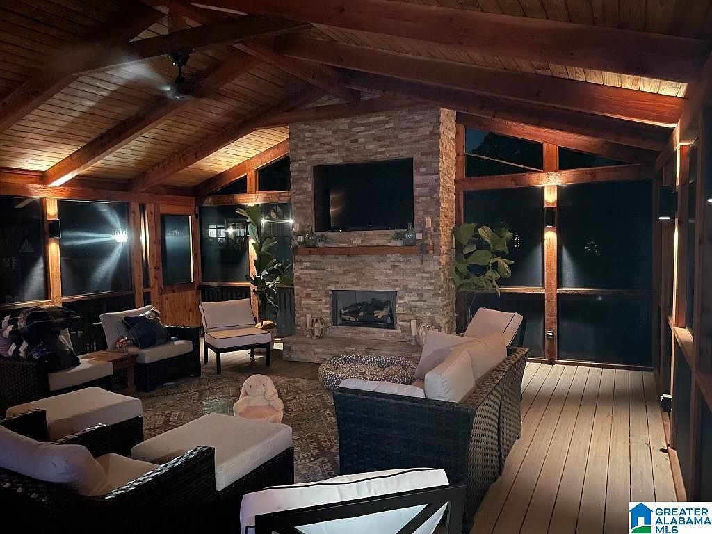 This inviting sunroom combines rustic charm with modern comforts, featuring a stunning stone fireplace as the focal point. The vaulted wooden ceiling enhances the spacious feel, while warm ambient lighting creates a cozy atmosphere. Comfortable seating arrangements with plush cushions encourage family gatherings, and the soft color palette—neutral tones with hints of deep blue—adds sophistication. Large windows and screened walls offer unobstructed views of the outdoors while ensuring bug-free relaxation. Lush greenery accentuates the space, contributing to a serene environment perfect for unwinding after a long day or enjoying weekend family time.