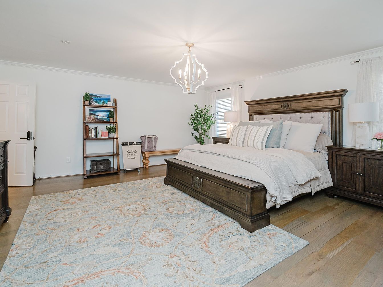 This master bedroom features a spacious and inviting layout designed for comfort and relaxation. A plush king-sized bed with a tufted headboard serves as the centerpiece, flanked by matching nightstands topped with contemporary lamps. The muted color palette of soft grays and warm wood tones fosters a soothing ambiance. An elegant chandelier adds charm, while large windows allow ample natural light, accentuating the tasteful decor. A cozy reading nook is highlighted by a stylish bookshelf and a decorative plant, creating a family-friendly environment that blends functionality with aesthetic appeal. Plush textiles soften the hardwood floors, enhancing the overall warmth.
