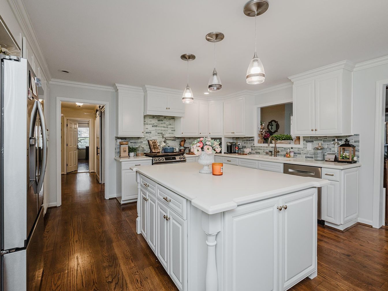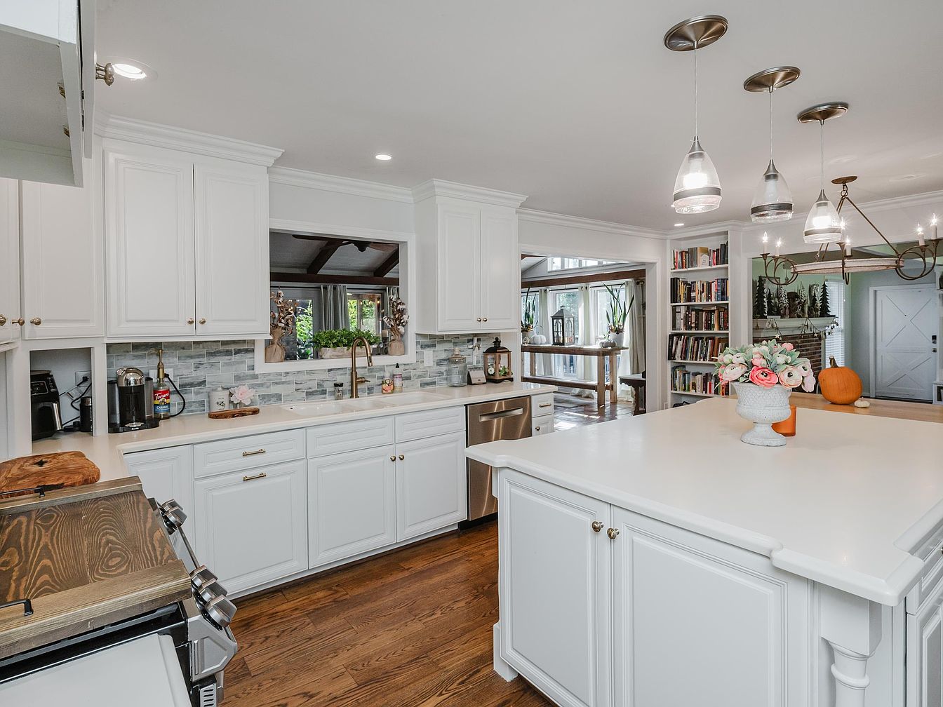 A modern kitchen that seamlessly blends functionality and style. The white cabinetry creates a clean and airy atmosphere, enhanced by the stylish gray backsplash that adds texture. A spacious island serves as a centerpiece, perfect for family gatherings or meal prep, topped with a smooth, light countertop. Thoughtfully arranged pendant lights cast a warm glow over the space. The open layout connects to a dining area bathed in natural light, fostering a welcoming environment. Ample storage options and an integrated coffee station ensure practicality, making this kitchen both an aesthetic and family-friendly hub.