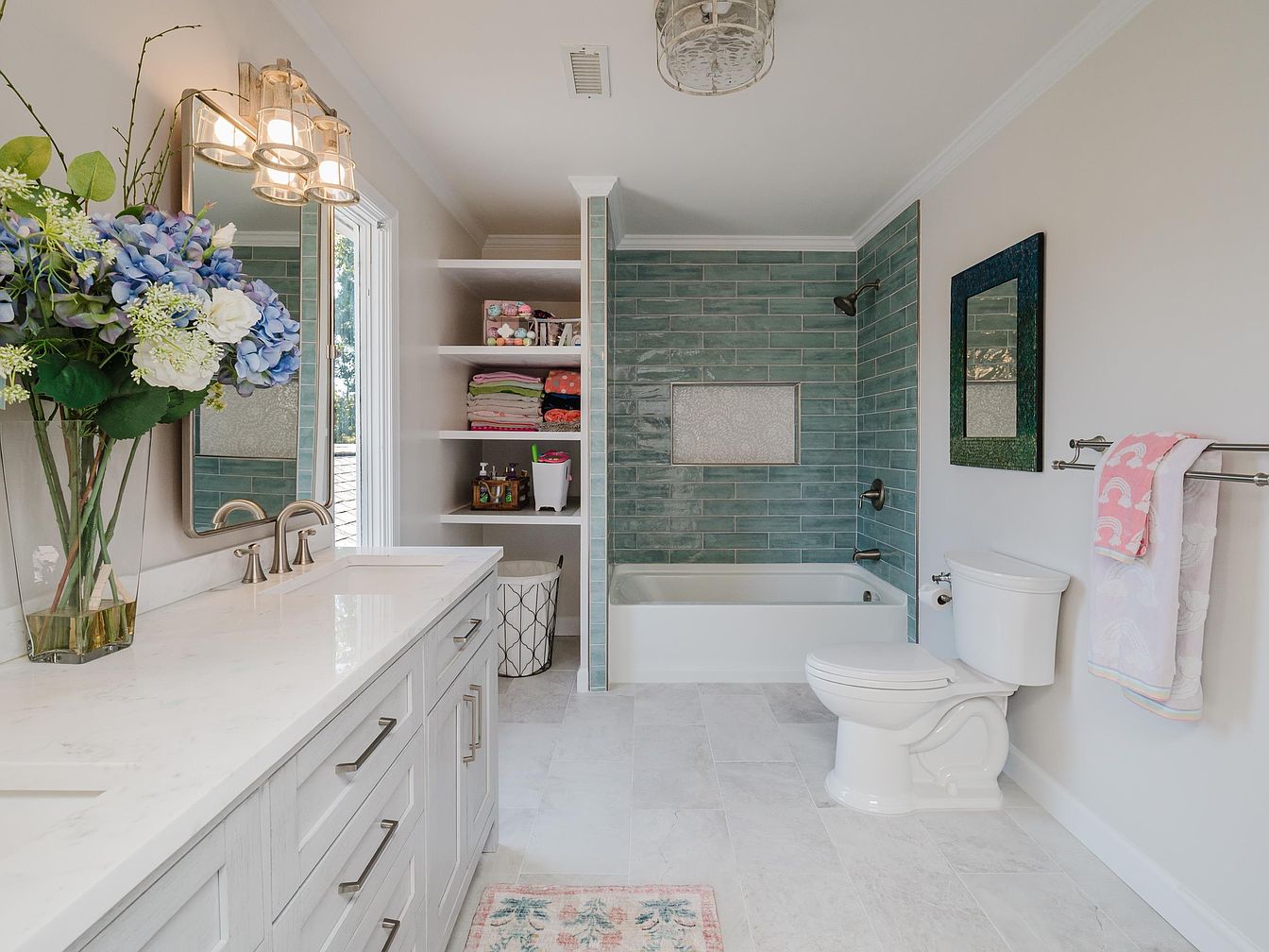 This elegant bathroom features a harmonious blend of modern and classic design elements. The light, airy layout is accentuated by large windows, brightening the space and offering a view of nature. A soft color palette of light gray and aqua blue tiles creates a calming atmosphere. The spacious quartz countertop provides ample room for personal items, complemented by stylish fixtures and an oversized mirror. Ample storage is available in open shelves adorned with neatly folded towels, while a luxurious soaking tub invites relaxation. Thoughtfully placed floral arrangements add a pop of color, enhancing the inviting ambiance.