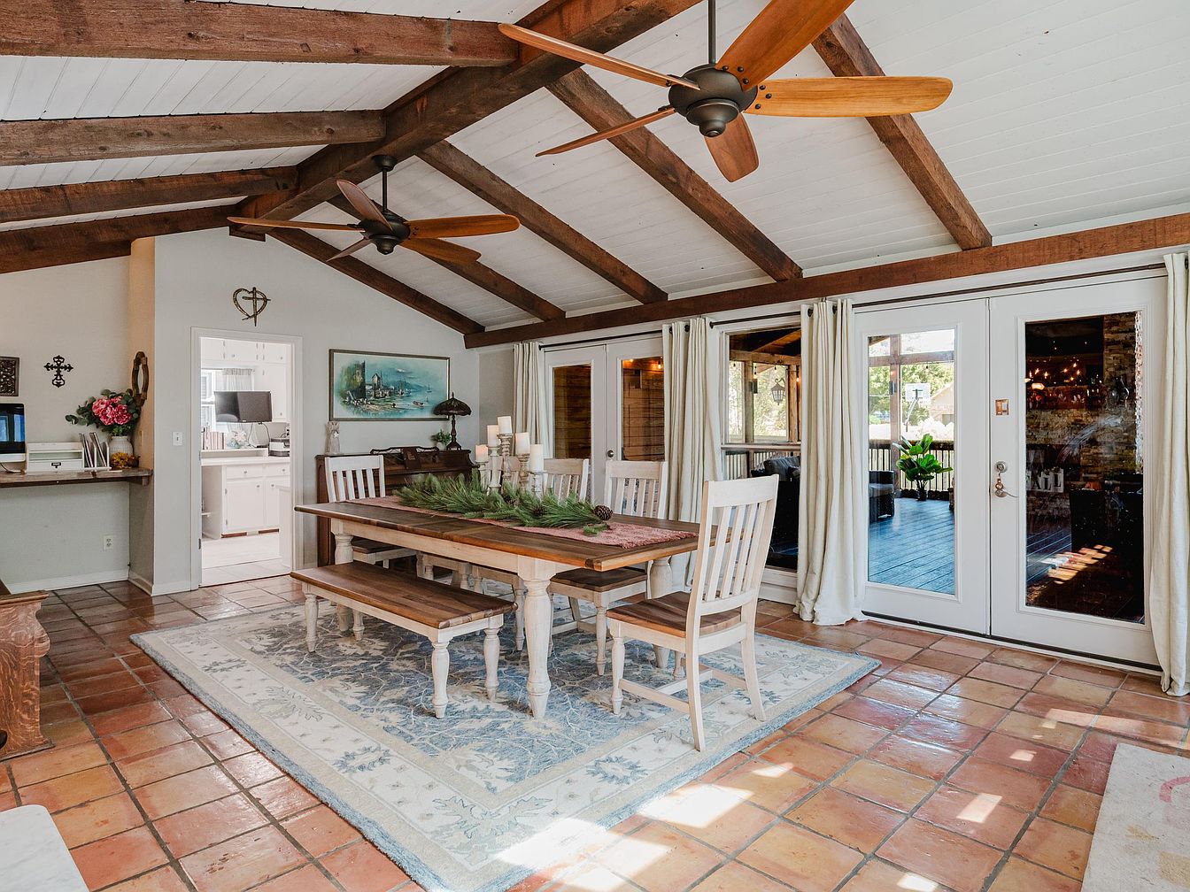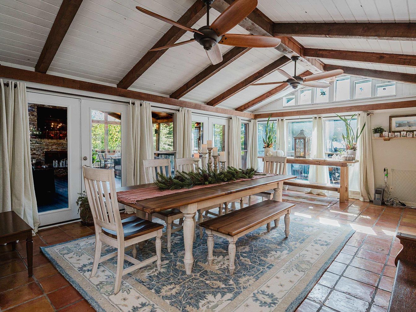 This inviting dining room combines rustic charm with modern comfort, featuring a spacious wooden table surrounded by light, classic chairs. Natural light floods the room through expansive windows adorned with soft, airy curtains. The exposed wooden beams and vaulted ceiling add warmth and character, while the terracotta tile flooring provides durability and visual interest. A subtle, patterned area rug grounds the space, enhancing its cozy atmosphere. Greenery accents the room, contributing freshness and a touch of nature. Ideal for family gatherings or intimate dinners, this room promotes a sense of togetherness and casual elegance.