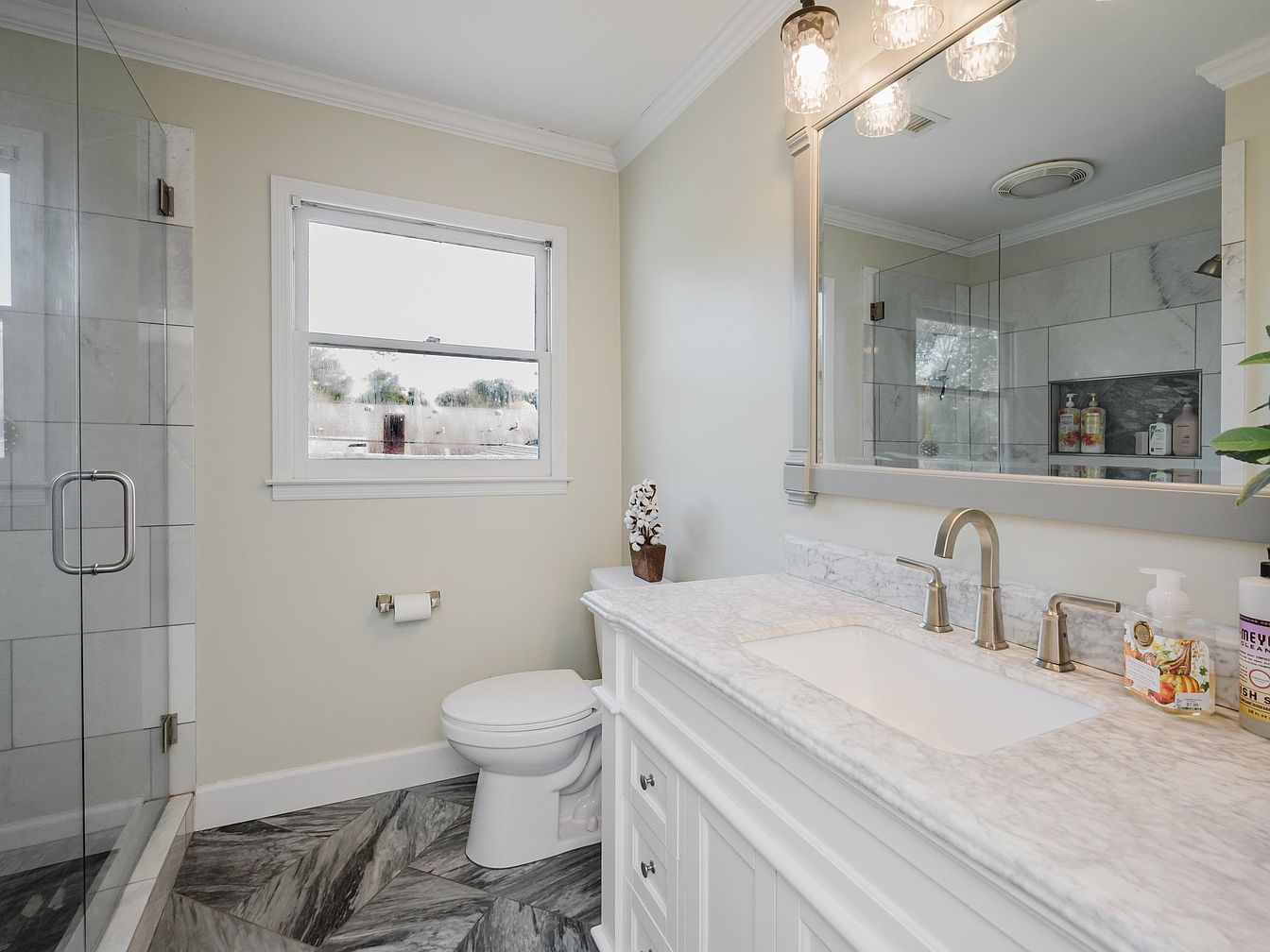 Bright and inviting, this modern bathroom features a spacious layout that combines functionality with elegance. The stylish marble countertop complements the pristine white cabinetry, providing ample storage. Natural light floods in through the window, illuminating the sleek chrome fixtures and giving warmth to the soft beige walls. A spacious glass shower adds a luxurious touch, while the contemporary tiled floor creates visual interest with its muted yet sophisticated patterns. Family-friendly elements such as easy-to-reach toiletries and a thoughtfully placed toilet enhance usability, ensuring this space meets the needs of daily life without sacrificing style.