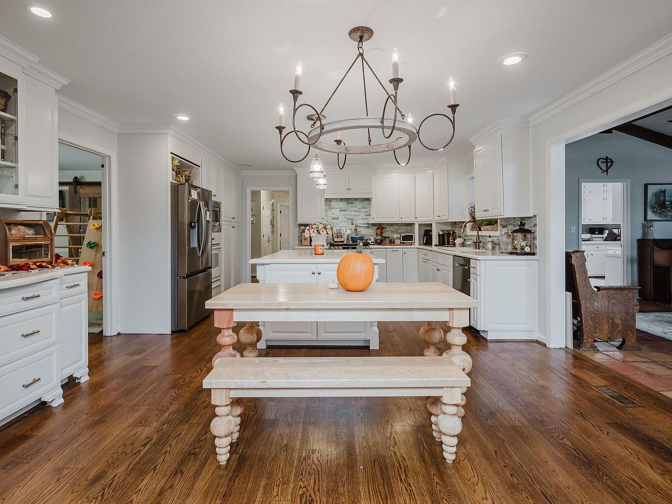 This inviting kitchen boasts a spacious layout, seamlessly blending functionality with aesthetic appeal. The white cabinetry enhances the airy atmosphere, complemented by warm wooden floors that add a cozy touch. A large dining table, featuring unique pedestal legs, serves as a central gathering point, perfect for family meals and casual gatherings. The modern farmhouse chandelier, with its rustic charm, illuminates the space while highlighting the subtle beauty of the tiled backsplash. Thoughtfully designed, the kitchen offers ample storage and a layout conducive to cooking and entertaining, making it a heartwarming space for family life.