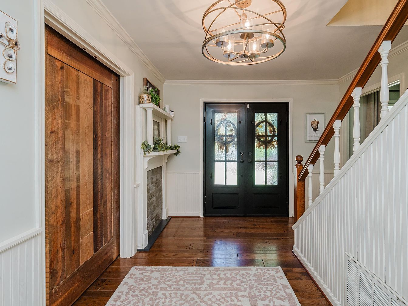 Step into this inviting entryway, where warmth greets you through rich wooden elements and a contemporary design. The focal point is the elegant black double doors adorned with wreaths, flanked by tasteful decor. Warm hardwood flooring extends throughout, complemented by a plush area rug that adds comfort. A statement chandelier illuminates the space from above, enhancing the airy feel. Architectural details such as the white wainscoting and charming mantelpiece provide character, while greenery accents bring a touch of nature indoors. This thoughtfully designed entrance is perfect for welcoming family and friends.