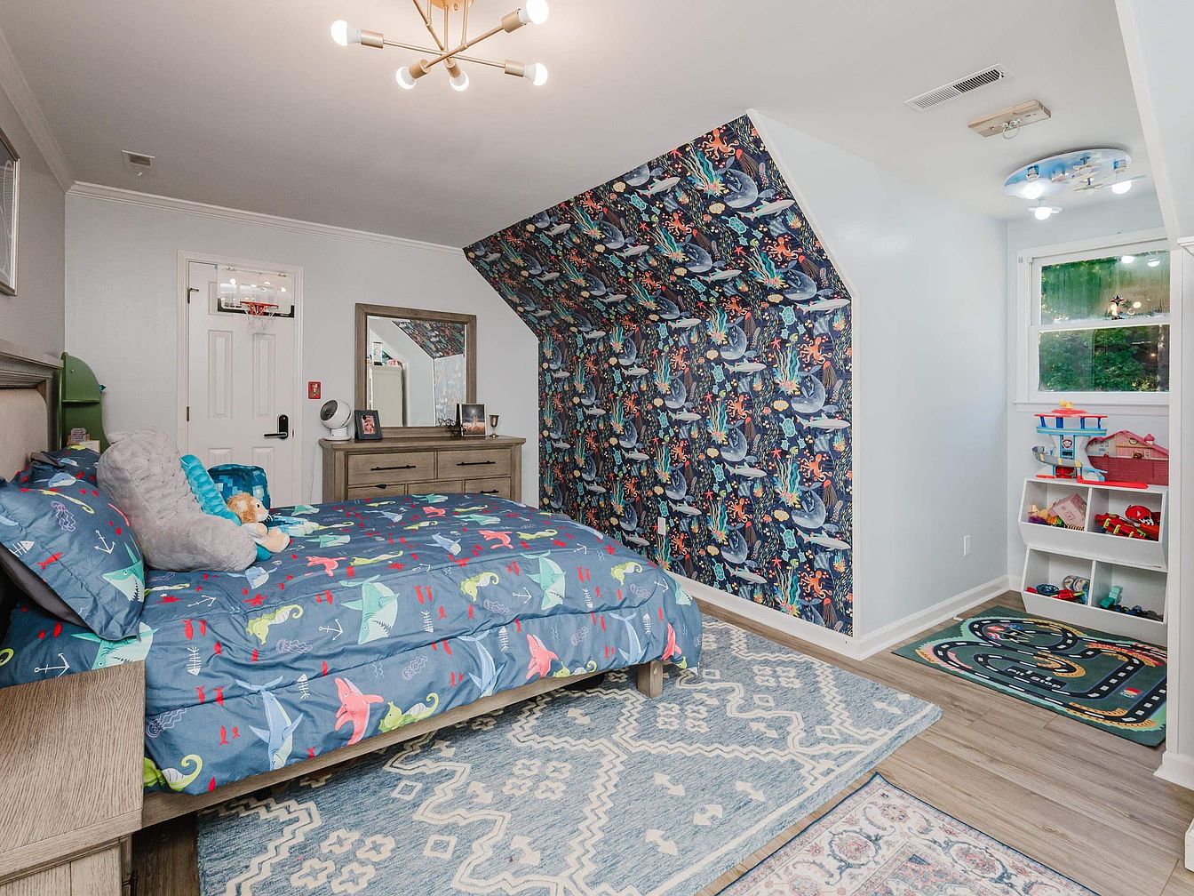 This charming kid’s bedroom features a whimsical ocean-themed design, accentuated by vibrant wallpaper adorned with marine life. The cozy bed is dressed in an engaging comforter, showcasing colorful sea creatures, which invites imagination and fun. A light wood dresser complements the space, paired with a stylish round mirror that enhances the room’s brightness. The soft area rug beneath adds warmth and comfort, perfect for play. Ample natural light streams in through the window, illuminating a corner nook designed for toys, promoting organization while keeping the area playful. Thoughtful architectural angles and cheerful decor create a nurturing, family-friendly atmosphere.