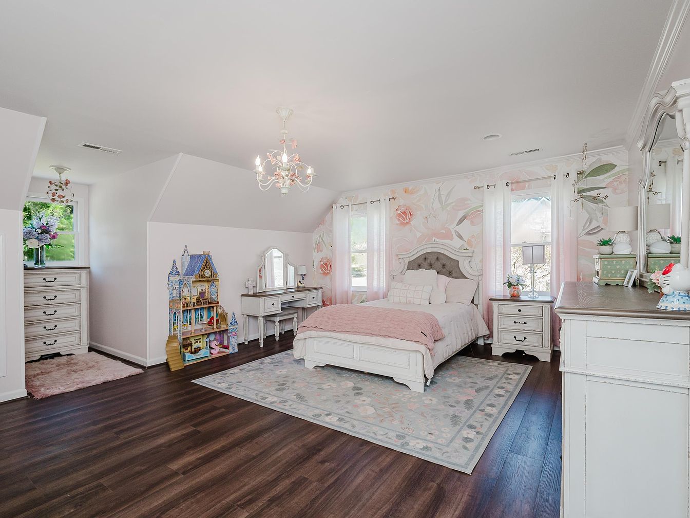 This charming kid’s bedroom exudes a whimsical and inviting atmosphere. Featuring an elegant blend of soft pinks and florals, the space is adorned with a delightful floral accent wall, creating a cheerful focal point. The room boasts a comfortable bed with plush bedding, accompanied by stylish furniture including a vintage-inspired dresser and a charming vanity. Natural light floods in through generous windows, enhanced by sheer curtains. A cozy area rug adds warmth to the sleek, dark wood flooring, while a beautiful chandelier completed the room’s enchanting vibe. A decorative play set brings a fun, playful element suitable for children.