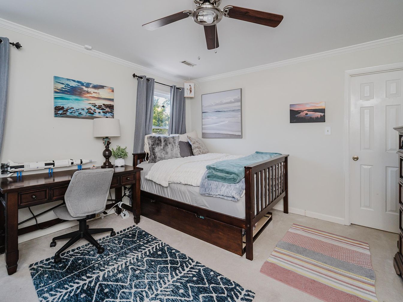 This inviting kid’s bedroom features a thoughtfully designed layout that balances comfort and functionality. A cozy bed is adorned with soft textures and blue accents, promoting a serene atmosphere. The large window, dressed with elegant gray curtains, allows ample natural light to fill the space, enhancing the warm, neutral color palette on the walls. A dedicated study area showcases a classic wooden desk paired with a modern gray chair, perfect for homework or creative projects. Artistic wall prints of coastal scenes, along with carefully selected decor, add playful character and encourage a peaceful retreat for relaxation and imagination.