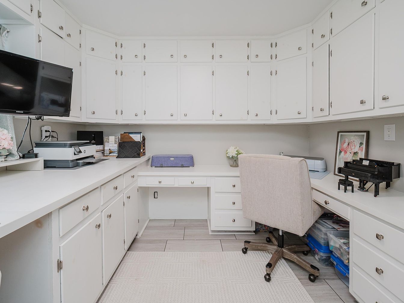 This inviting home office features a spacious layout, designed for both productivity and comfort. The white cabinetry provides ample storage, while the light gray walls create a serene backdrop. A modern desk area, complete with a plush, rolling chair, invites creativity, and the warm, neutral tones are complemented by a soft area rug underfoot. A well-placed television ensures easy access to information or entertainment. Thoughtful details like floral decor and personal touches add warmth, making this space perfect for family use and daily activities. The overall aesthetic combines functionality with a relaxed, sophisticated charm.