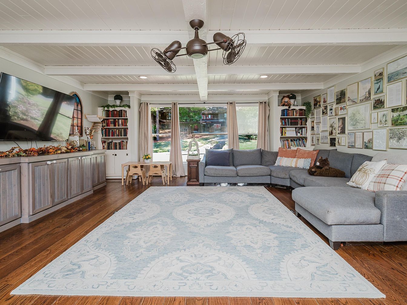 This inviting living room features an open layout with vaulted ceilings adorned by exposed beams, creating a spacious and airy atmosphere. A plush, gray sectional sofa is perfectly positioned for family gatherings, complemented by decorative cushions adding warmth. A large, textured area rug anchors the seating area, while a modern television is mounted above a rustic sideboard, enhancing entertainment options. Natural light floods in through large windows, flanked by soft, flowing curtains. A charming children’s table invites play, and the gallery wall, filled with framed art, adds a personal touch, making this space both stylish and family-friendly.
