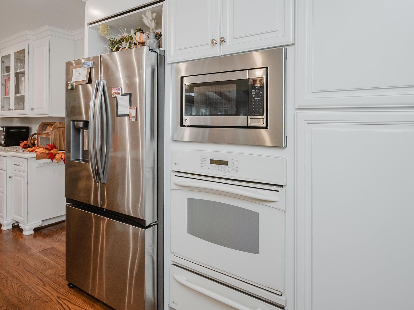 This kitchen features a sleek arrangement of modern stainless steel appliances, including a side-by-side refrigerator and built-in oven units. The white cabinetry provides a crisp, clean backdrop, highlighting the stylish quartz countertops adorned with a seasonal touch of autumn leaves. Ample storage and smart design elements cater to family needs, ensuring ease of access. The rich wooden floor contrasts beautifully with the light cabinetry, creating warmth and inviting ambiance. Functionality meets aesthetics in this layout, making it perfect for both cooking and gathering, while soft gold hardware adds a hint of elegance to the overall look.