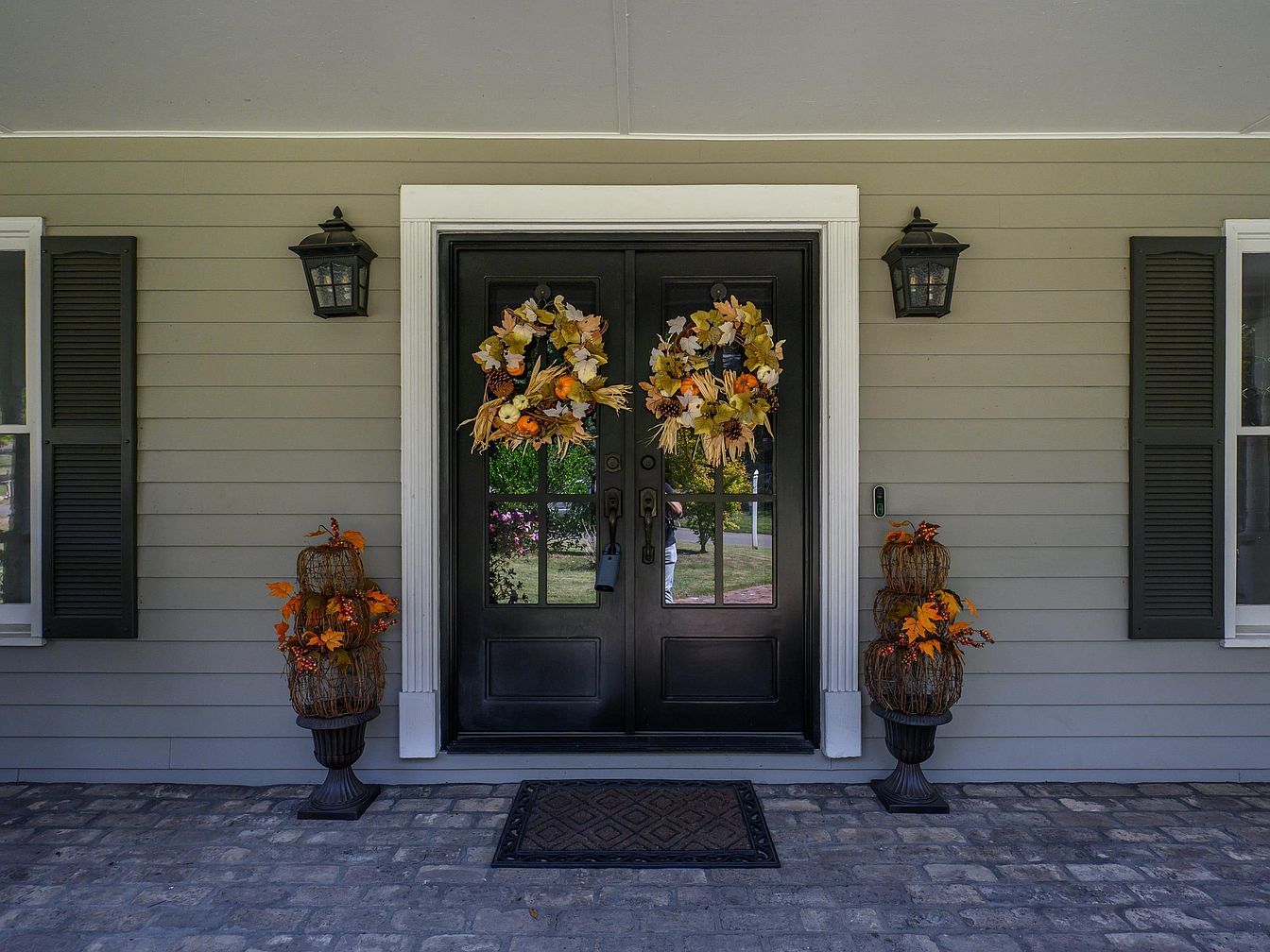 This charming front entrance is designed for a warm welcome, featuring a classic black door adorned with a vibrant autumn wreath that bursts with seasonal colors. Flanking the door are elegant shutters in a deep green, enhancing the home’s traditional aesthetic. Tasteful lanterns above cast a cozy glow, while decorative planters with intricately arranged foliage add a touch of nature. The sturdy stone-paved pathway leads visitors to the door, creating an inviting atmosphere. Perfectly suited for family gatherings, this entryway harmonizes style with functional beauty, offering a vibrant first impression that reflects a home filled with warmth and hospitality.