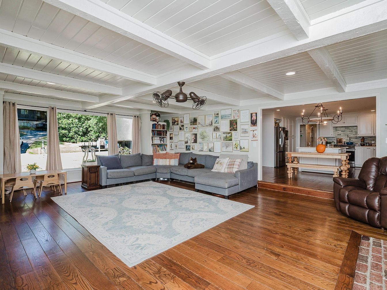 This inviting living room boasts an open layout enhanced by exposed wooden beams and natural light streaming through large windows. A plush grey sectional and a warm brown recliner create a cozy seating arrangement, complemented by a soft blue area rug that adds a touch of elegance. Family-friendly features include a durable hardwood floor and a kid-friendly play area, evident with small tables and chairs. The wall adorned with an eclectic mix of framed art adds personality and warmth. Adjacent to the space, a seamless flow leads to the stylish kitchen, showcasing modern appliances and tasteful décor.