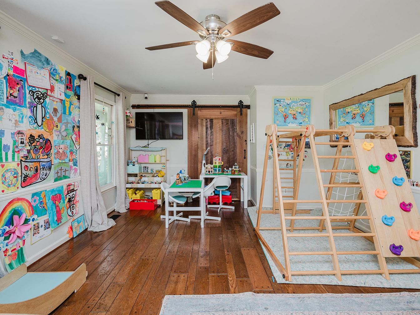 The vibrant kid’s playroom exudes warmth and creativity, showcasing a wall filled with colorful children’s artwork that invites imagination. Natural light pours in from large windows, enhanced by soft drapes, creating a cheerful atmosphere. Hardwood flooring adds a rustic charm, while playful furniture pieces, including a mini table and chairs, cater to engagement and creativity. A wooden play structure with climbing elements promotes active play, balanced by a soft rug, ensuring safety. A thoughtfully designed shelving unit holds an array of toys and crafts, emphasizing organization and accessibility, making this space both fun and functional for family activities.