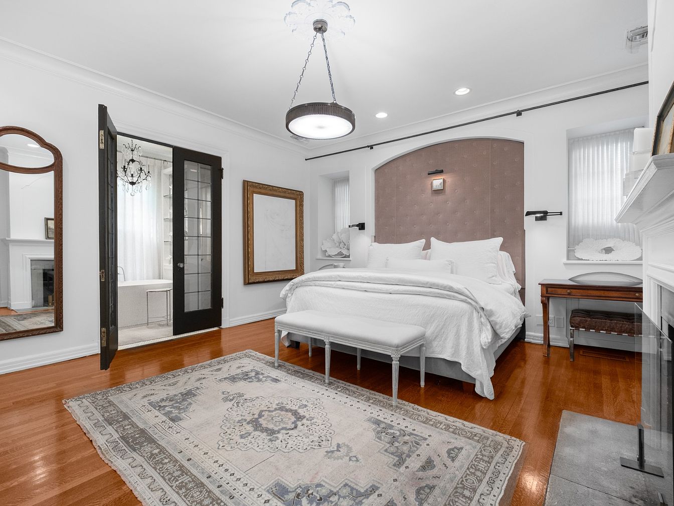 Spacious and serene, this master bedroom features a grand upholstered headboard set between two windows, bathing the space in gentle natural light. Soft white bedding, a plush bench at the bed’s foot, and an ornate area rug add comfort and elegance. Warm hardwood floors balance the crisp white walls and ceiling, while black-framed French doors lead to a luxurious bathroom. A large mirror and simple furnishings ensure ample space to move about. The calm color palette and cozy textiles make this room ideal for relaxing or spending family time, while thoughtful details like recessed lighting enhance the inviting ambiance.