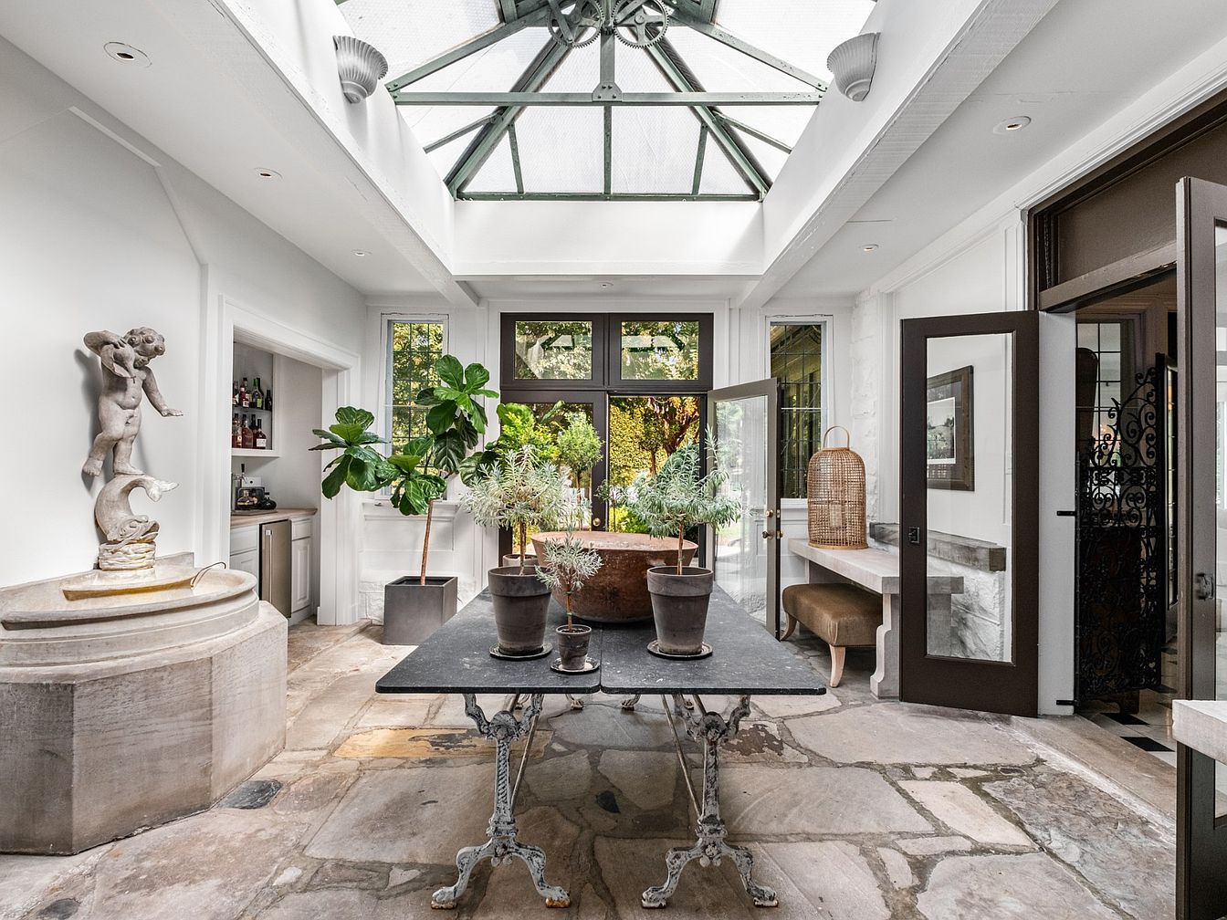 This luminous sunroom atrium blends classic elegance with modern comfort, making it perfect for family gatherings or quiet afternoons. A soaring glass ceiling fills the space with natural light, highlighting neutral stone flooring and crisp white walls for a timeless ambiance. A charming stone fountain with a sculpted cherub adds a whimsical touch, while live potted plants and greenery bring freshness and life indoors. The wrought iron-legged table at the center offers versatility, suitable for children’s crafts or serving as a welcoming centerpiece. French doors open to a lush garden, seamlessly connecting indoor and outdoor living areas for a truly inviting family-oriented retreat.