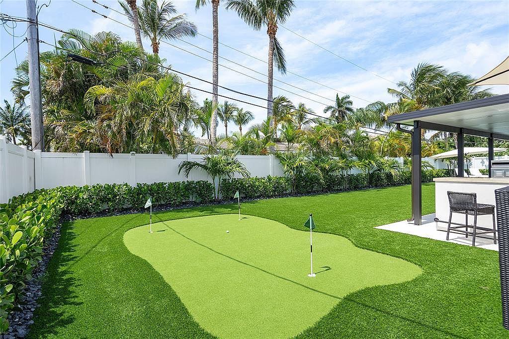This stunning backyard features a well-manicured lawn, complete with a synthetic putting green that invites family fun and friendly games. Lush tropical plants line the borders, creating a private sanctuary surrounded by nature. The patio area, shaded by a modern overhang, houses stylish outdoor seating, perfect for entertaining guests or enjoying relaxed evenings outdoors. The color palette of rich greens, complemented by clean white fencing, enhances the inviting atmosphere. Thoughtfully designed for family enjoyment, this outdoor space combines leisure and elegance, making it ideal for both casual gatherings and serene moments in a tranquil environment.