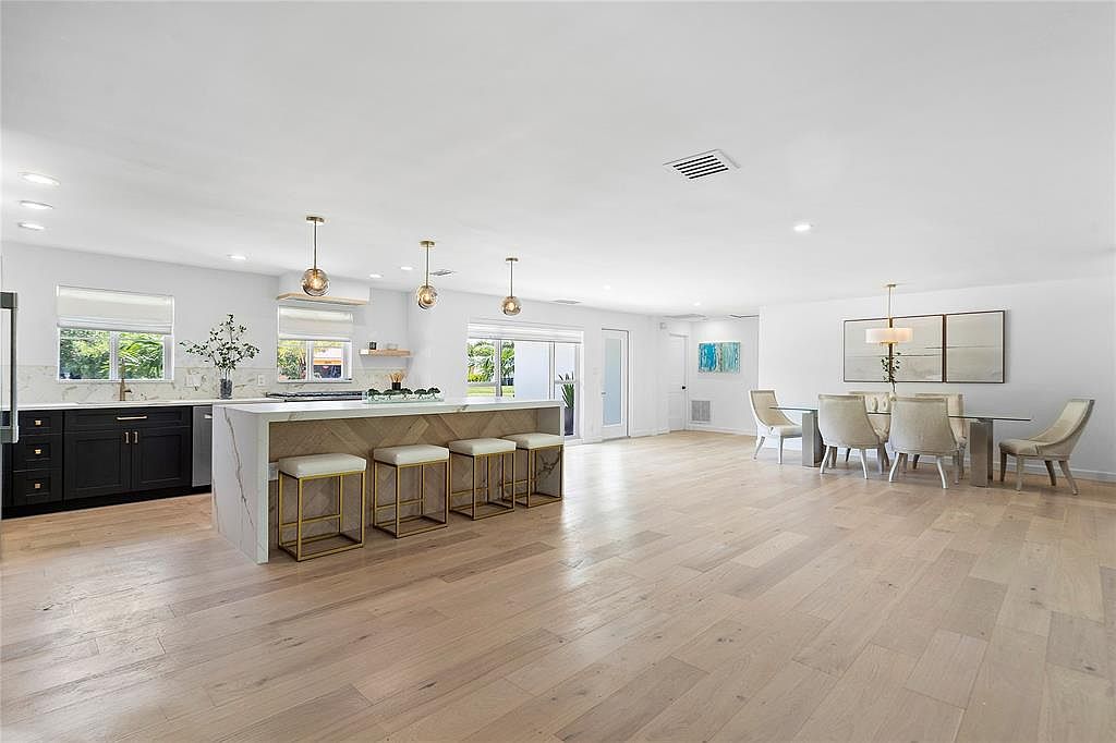 This modern open-concept space seamlessly integrates the kitchen and dining areas, enhancing the flow of the home. Natural light floods in through large windows, highlighting the elegant white cabinetry and sleek black accents of the kitchen. A stunning marble island serves as a functional centerpiece, complemented by stylish gold and white bar stools. Adjacent, a cozy dining area features plush upholstered chairs and a simple yet refined table, perfect for family gatherings. The warm wooden flooring and soft color palette create an inviting atmosphere, making this space ideal for both everyday living and entertaining.