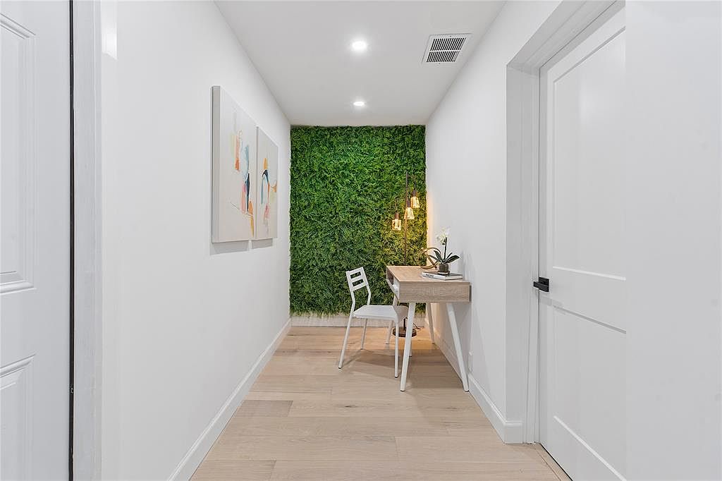 This entryway captures a refreshing blend of modern minimalism and nature-inspired charm. The bright white walls create a clean backdrop, showcasing two vibrant artworks that add personality and warmth. A striking vertical garden wall brings a breath of fresh air and lively greenery, beautifully contrasted against the sleek, light hardwood flooring. A minimalist wooden desk, paired with a white chair, offers a functional yet stylish nook for work or contemplation. Soft pendant lighting enhances the inviting atmosphere, making it a perfect family-friendly space that sets a welcoming tone for the rest of the home.