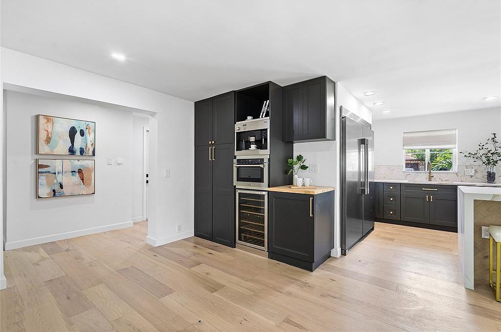 This modern kitchen features a sleek and functional layout that seamlessly integrates style and efficiency. Dark cabinetry adds depth, complemented by warm wooden accents on the countertop. A built-in wine cooler and microwave enhance convenience, making it perfect for family gatherings. Light, airy tones dominate the space, while the hardwood flooring contributes to a cozy ambiance. Large windows invite natural light, showcasing the beautiful outdoor view. High-end appliances ensure culinary excellence, and the marble backsplash adds a touch of elegance. This kitchen serves as a heartwarming hub for family interactions and culinary creativity.