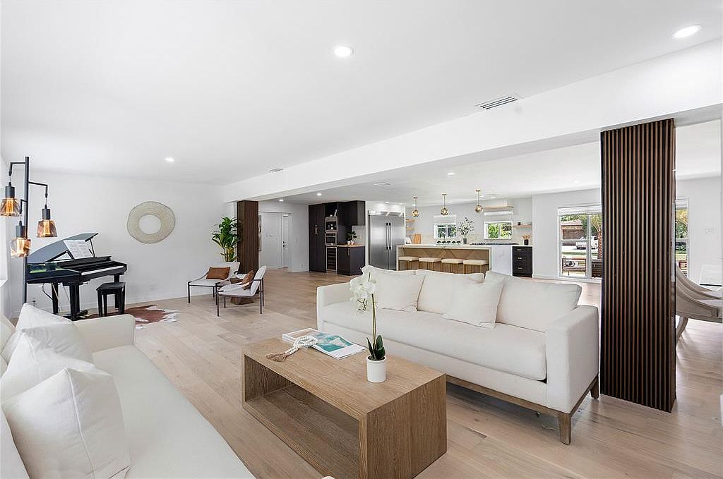 This spacious living area features an open floor plan, seamlessly connecting to the dining and kitchen spaces. The bright, airy ambiance is accentuated by white walls and warm wood flooring, creating an inviting atmosphere. A plush, white sofa anchors the room, paired with a modern wooden coffee table, promoting family gatherings. The sleek black piano adds a touch of elegance, while stylish lighting fixtures provide a warm glow. Thoughtfully placed greenery enhances the room’s natural feel. Architectural details, like the softly curved wall and textured wooden pillar, add character, making it a perfect blend of comfort and sophistication.