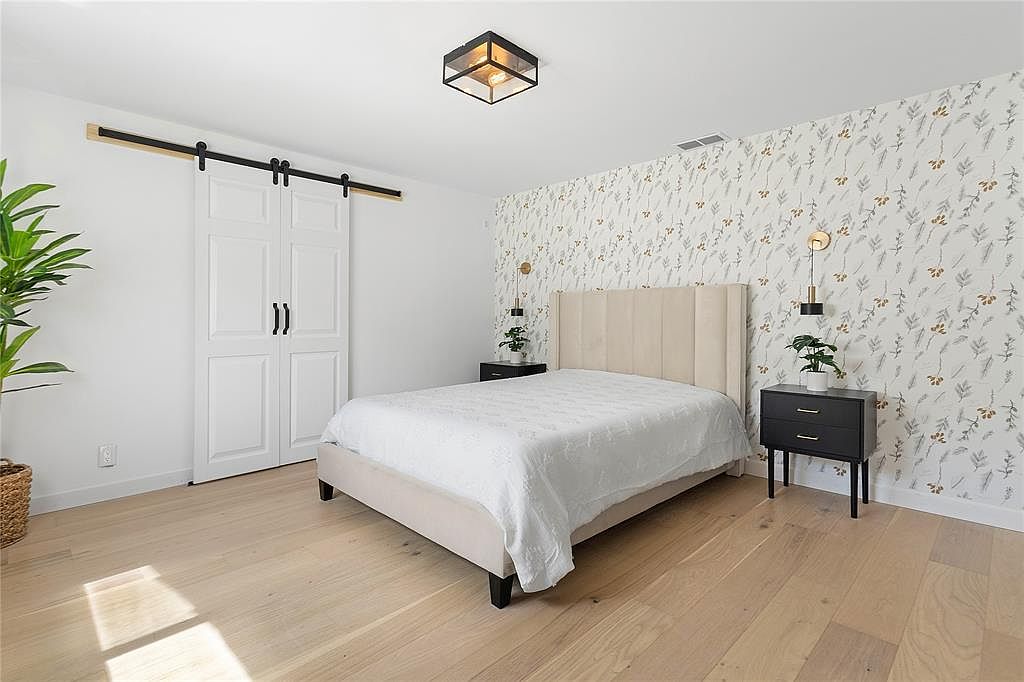 This serene master bedroom features a modern design complemented by a soft color palette of whites and subtle floral patterns. The focal point is a plush, upholstered bed with a tall headboard, providing comfort and elegance. Flanking the bed are sleek nightstands, each adorned with stylish, minimalist lamps that cast a warm glow. A sliding barn door adds a unique architectural detail, enhancing the room’s charm while providing easy access to storage. Warm wooden floors contribute to a cozy atmosphere, and a lush green plant brings a touch of nature indoors, perfect for a relaxing retreat.