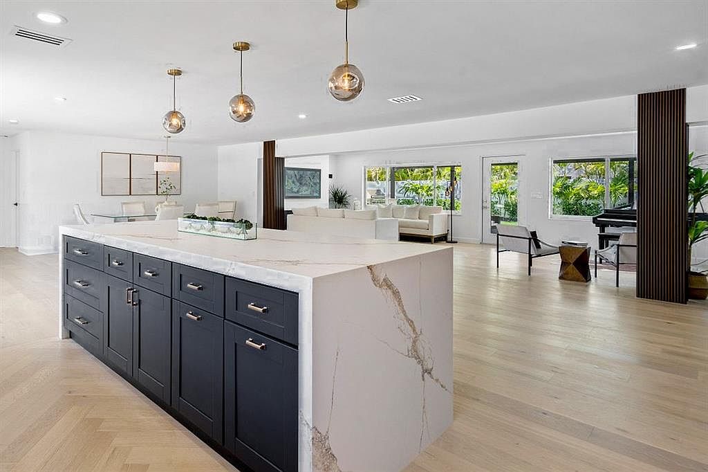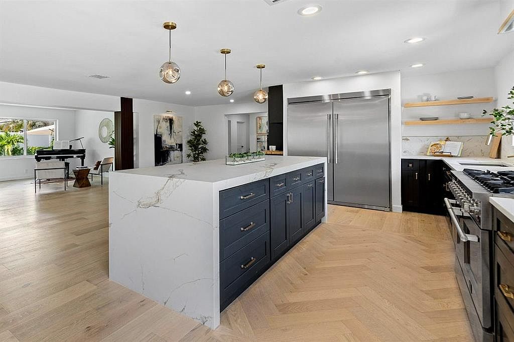 This contemporary kitchen boasts a spacious layout centered around a stunning island featuring a sleek white marble countertop complemented by deep navy cabinetry. The harmonious blend of light and dark colors creates a warm, inviting atmosphere. Pendant lighting adds a touch of elegance, illuminating the space while enhancing functionality. High-end stainless steel appliances seamlessly integrate with the cabinetry, offering both style and practicality. The open floor plan connects the kitchen to the living area, ideal for family gatherings or entertaining guests. Large windows invite natural light, emphasizing the beautiful herringbone wood flooring that enhances the room’s charm.