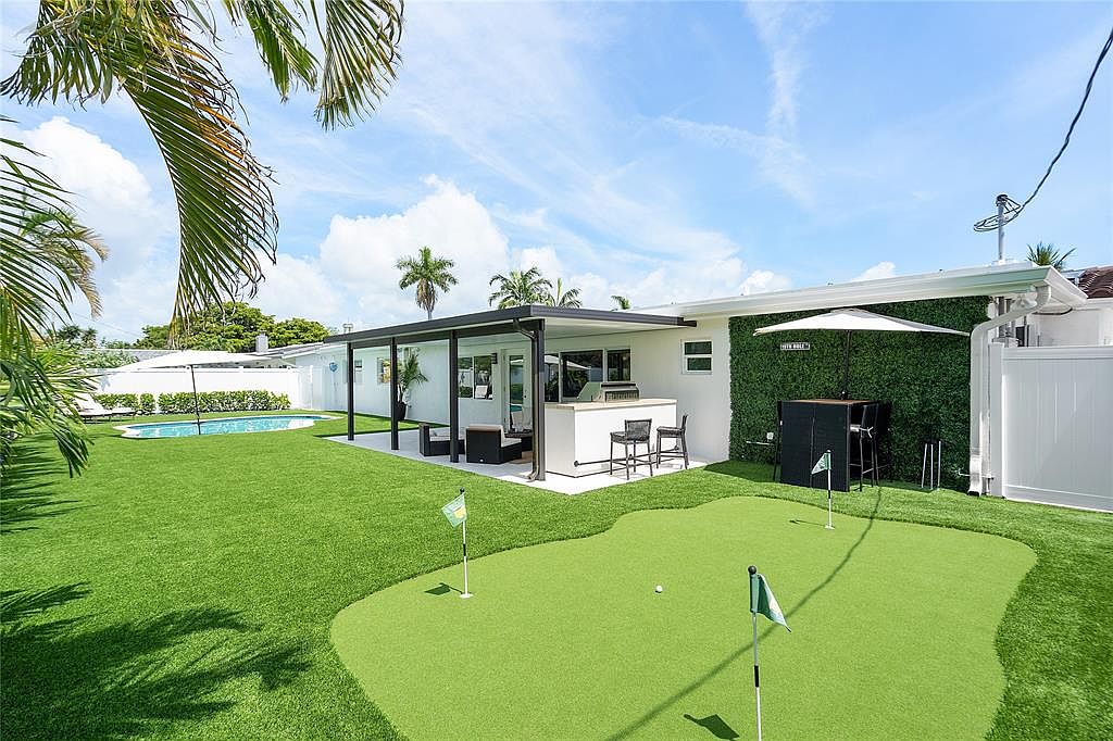 This inviting outdoor living space combines modern style with family-friendly features. A sleek covered patio area is equipped with a stylish bar, complemented by comfortable seating where family and friends can gather. Lush green grass extends, highlighting a private putting green, ideal for leisurely afternoons. A sparkling pool in the backdrop adds a refreshing touch, perfect for sunny days. The space showcases a contemporary aesthetic with clean lines and a harmonious color scheme of whites and greens, creating a tranquil atmosphere. Mature palm trees enhance the tropical feel, offering shade and privacy to this serene retreat.