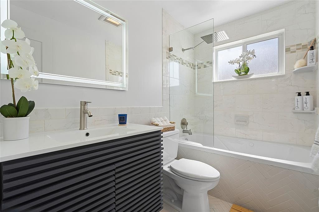 This modern bathroom features a clean, minimalist layout with a luxurious feel. The sleek black cabinetry showcases horizontal lines, adding a contemporary touch while providing ample storage. A quartz countertop complements the vanity, blending function with style. Soft, natural lighting pours in through the frosted window, highlighting the elegant marble tiling that extends along the walls and floor in a herringbone pattern. An open glass shower enhances accessibility and space, while a bathtub invites relaxation. Accents like a potted orchid and tasteful toiletries add warmth, making this stylish sanctuary perfect for family living or unwinding after a long day.