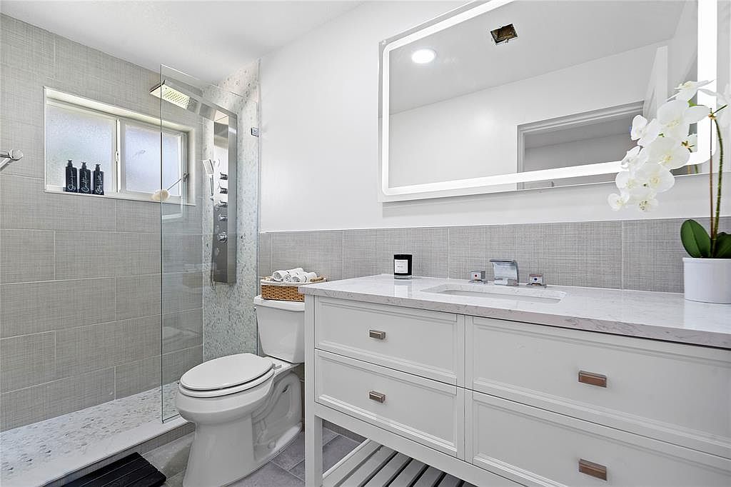 This modern bathroom features a sleek design with a spacious glass shower, promoting an open and airy feel. Neutral gray tiles line the walls, complemented by a subtle patterned backsplash that adds sophistication. A stylish vanity with a marble countertop provides ample storage and an elegant space for daily routines. The large mirror enhances brightness, while a delicate orchid adds a touch of nature. Family-friendly elements include a soft-close toilet and easy-to-clean surfaces, ensuring both comfort and practicality. Natural light filters through the window, creating a serene environment ideal for relaxation and rejuvenation.