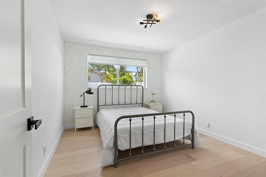 This serene bedroom combines modern aesthetics with comfort, featuring a stylish metal bed frame that contrasts beautifully with the crisp white walls. Natural light pours in through a large window adorned with minimalist blinds, illuminating the light hardwood flooring that enhances the spacious feel. A delicate floral wallpaper adds a touch of elegance, while a small nightstand and a sleek desk lamp provide functional charm. The room’s layout promotes a clutter-free atmosphere, ideal for relaxation. This design embraces simplicity, making it a welcoming retreat for family members after a long day.