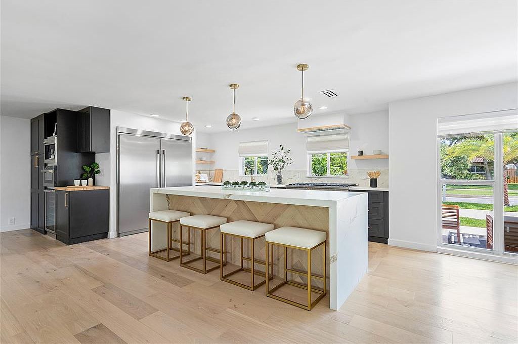 This contemporary kitchen features a sleek, open layout perfectly suited for family gatherings. A large island with a striking marble finish serves as the focal point, complemented by stylish gold-accented stools. Dark cabinetry contrasts beautifully with the light wood flooring, creating a balanced aesthetic. Ample natural light floods the space through large windows, offering views of the lush outdoor area, while sleek stainless steel appliances add a modern touch. Thoughtful design elements include practical storage solutions and an integrated coffee station, enhancing functionality. This inviting kitchen is ideal for both everyday meals and entertaining guests.