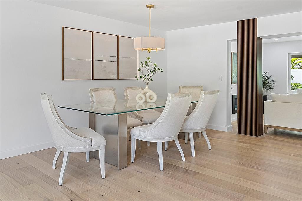 This sophisticated dining room features a modern glass table paired with elegantly upholstered white chairs, creating a light and airy atmosphere. The seamless integration of natural light enhances the warm tones of the hardwood flooring and complements the minimalistic décor. A stylish pendant lamp hovers above the table, providing a soft glow for intimate gatherings. Decorative artwork graces the wall, adding a touch of sophistication. The open layout flows effortlessly into adjacent spaces, promoting family interaction and comfort. Architectural details like the uniquely designed column contribute to the contemporary vibe, making this dining area both functional and aesthetically pleasing.